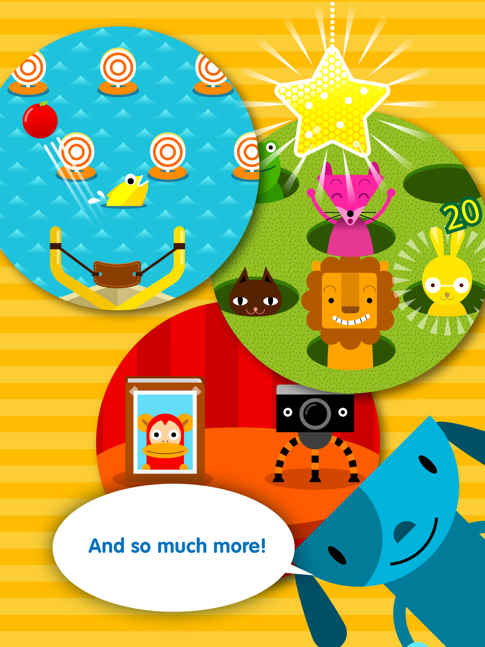 • 6 fun mini games that include a Catch Game, Animated Puzzles, a Tap the Character Game, a Photo Booth, a Sling and Target Game, and Animated Matching Games.