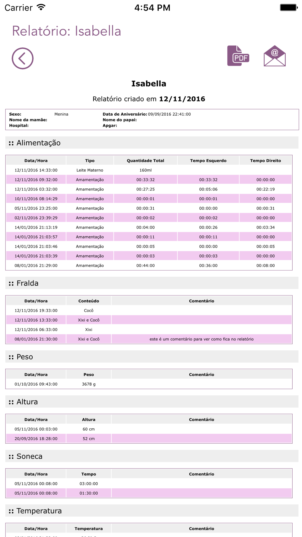 - Fraldas: Você quer saber quantas trocas de fraldas foram feitas em um determinado dia, e qual o conteúdo para ver se o sistema urinário e intestino estão funcionando corretamente;