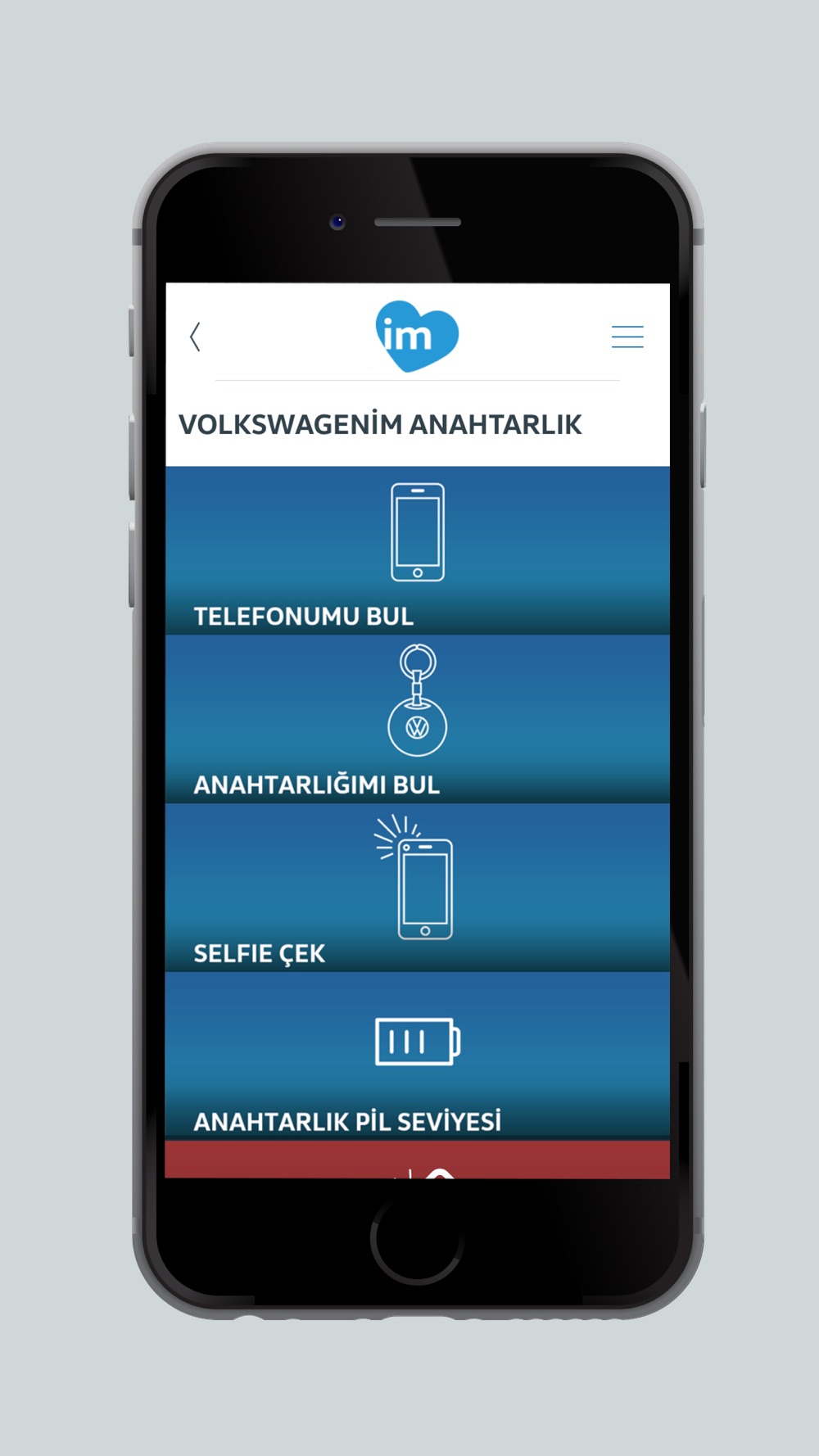 Uygulamaya entegre olan Volkswagenim Anahtarlık ile hayat artık daha kolay! Volkswagenim ile anahtarınızın ve telefonunuzun yerini lokasyon gösterimi ve ses sinyalleri ile tespit edebilirsiniz. Volkswagenim Anahtarlığınızı ayrıca, Selfie çekmek için bir uzaktan kumanda olarak da kullanabilirsiniz.