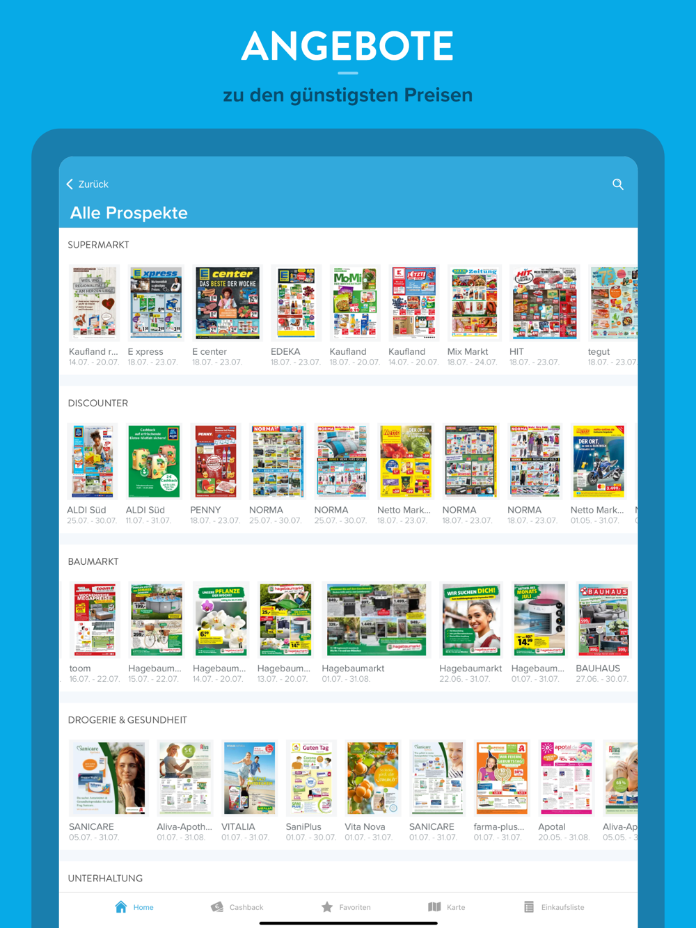 Prospekte und Angebote jeglicher Supermärkte, Discounter, Elektromärkte, Baumärkte, Sportgeschäfte, Möbelhäuser, Drogerien, Biomärkte, u.v.m.Aktuelle Aktionen diverser Händler, Filialen und Shops, wie z.B. Kaufland, Aldi, Netto, Media Markt, real,-, Norma, Müller Drogeriemarkt, Rossmann, Metro,Edeka, NKD, Saturn, Roller, McDonald's, Galeria Kaufhof, denn's Biomarkt, Kentucky Fried Chicken, toom Getränkemarkt, Zoo & Co