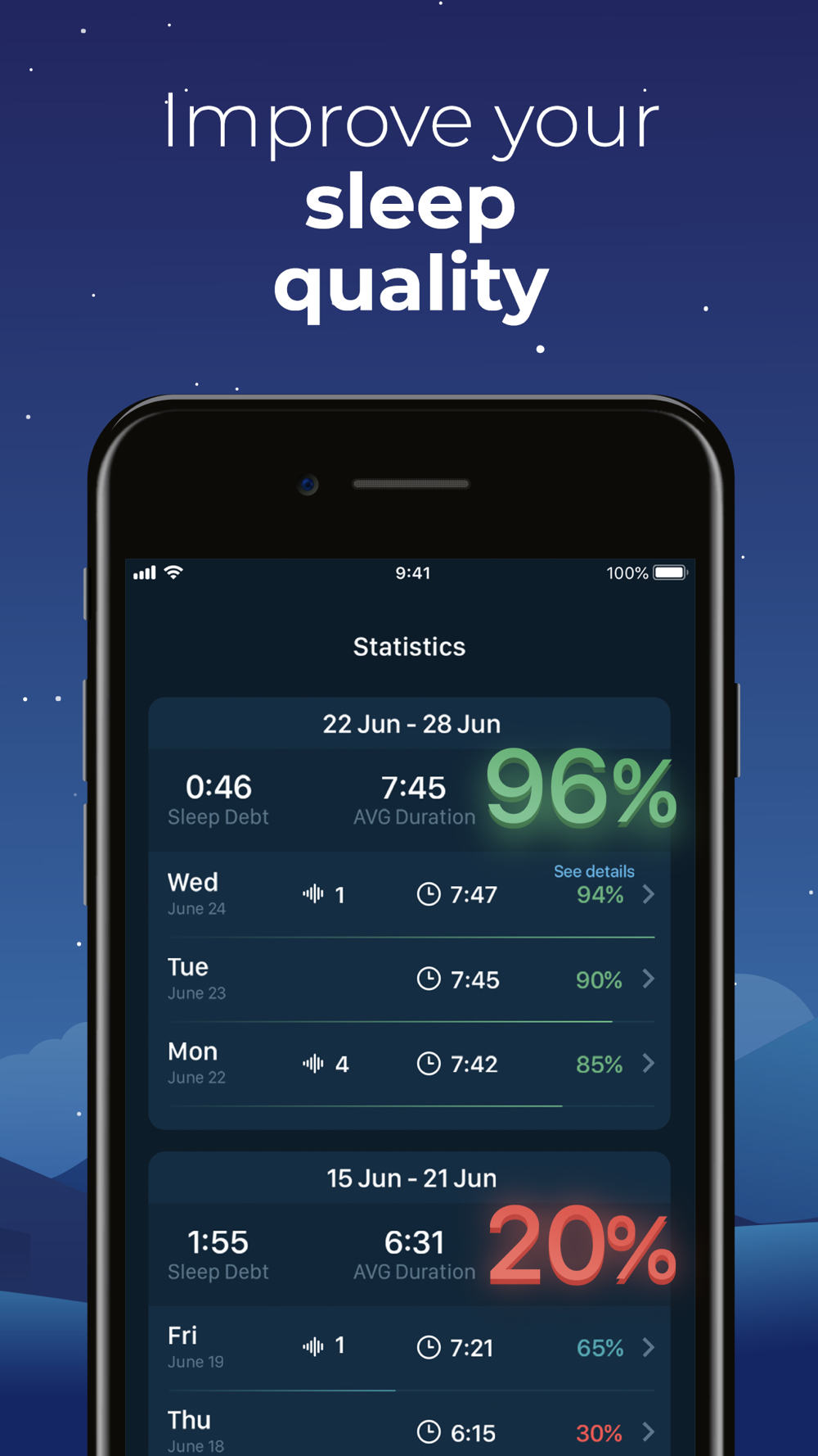- Set your Sleep Goal and track Sleep Debt - stay motivated to get enough hours of sleep