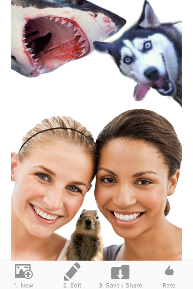 You to start with an image from your library or camera and then tweak it with one of more than 100 different photo bombers such as funny animals, monsters, food, landmarks and more . See the screen shots - these can be create in seconds. It's so easy and fun!