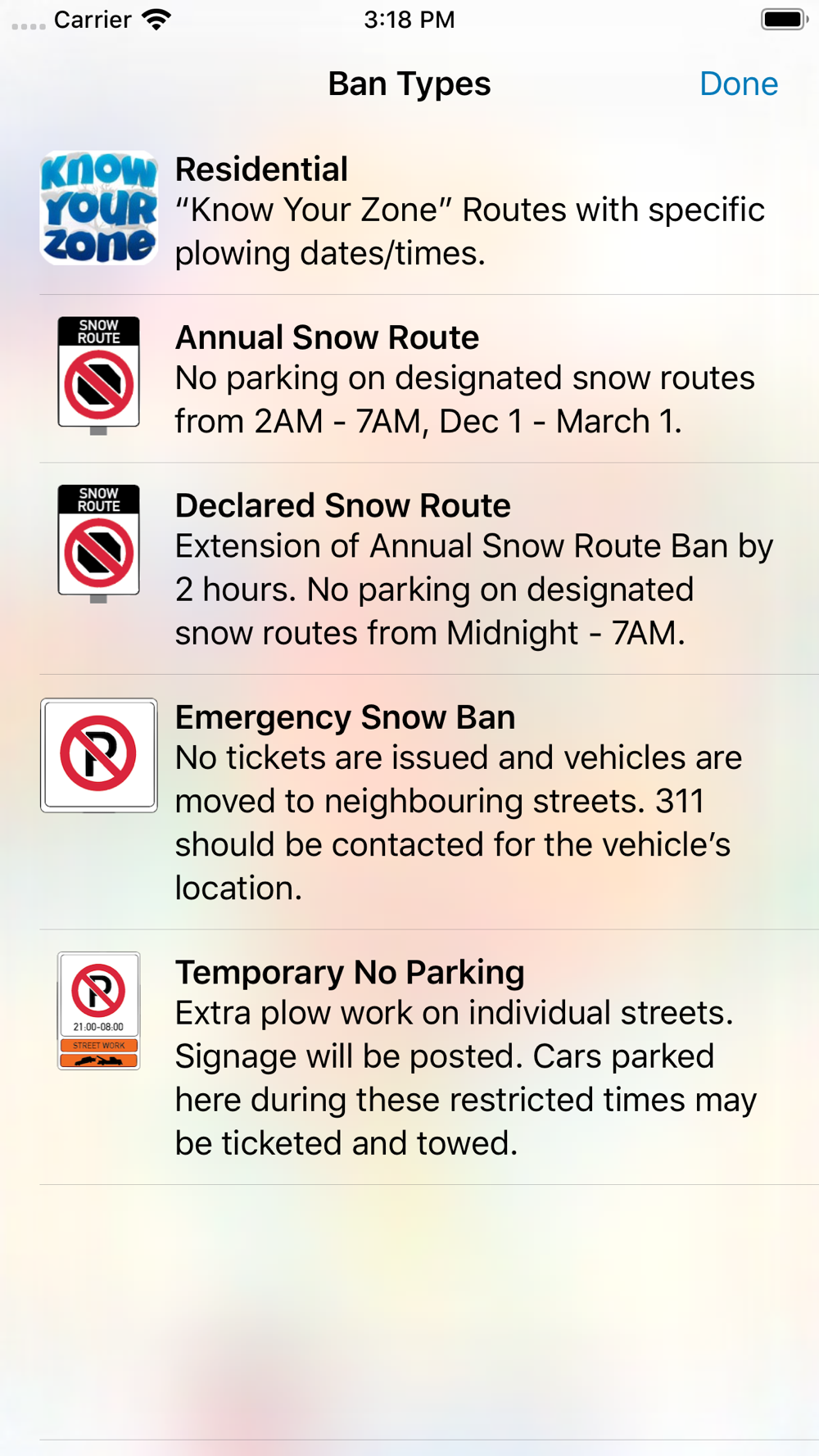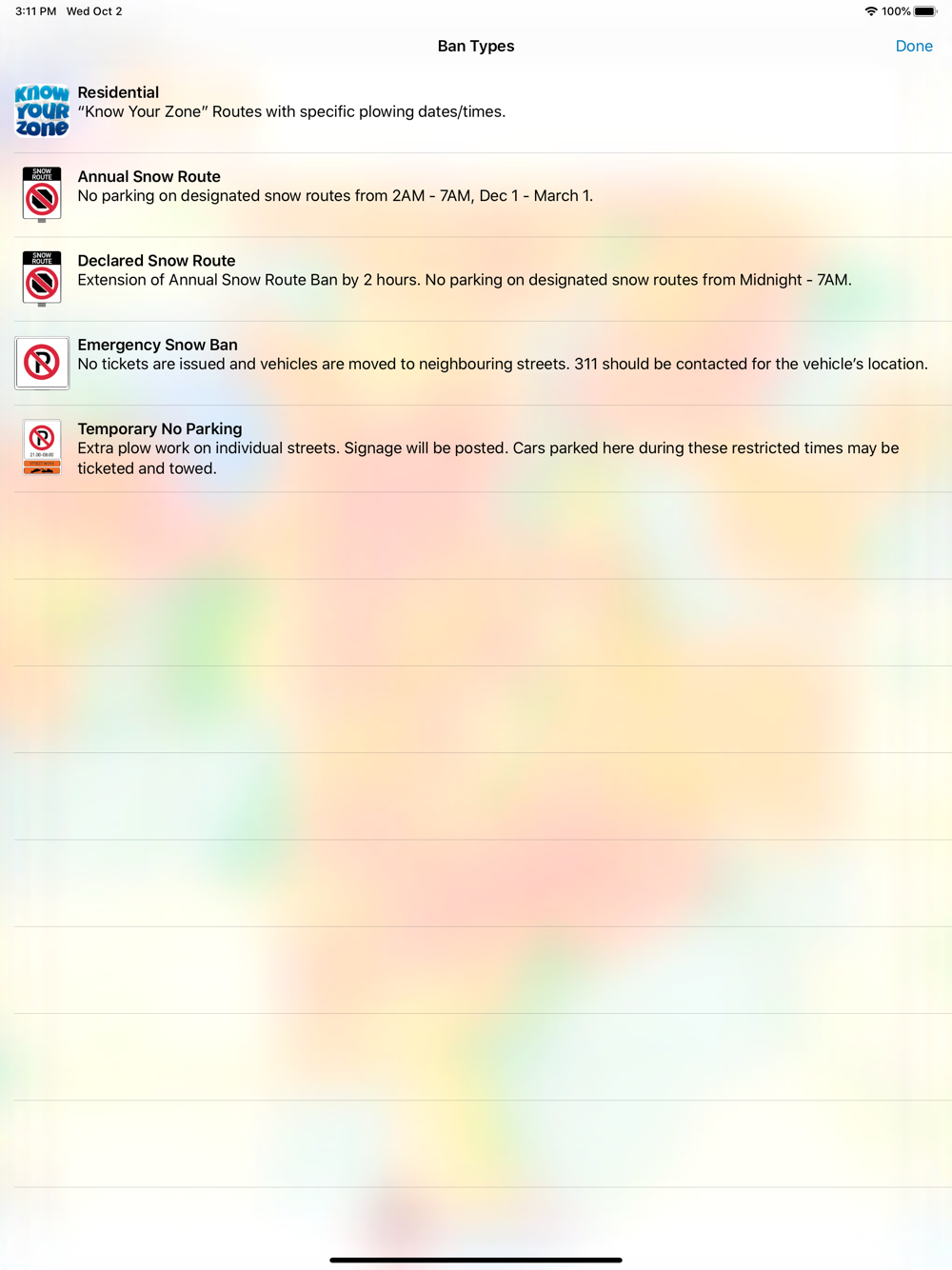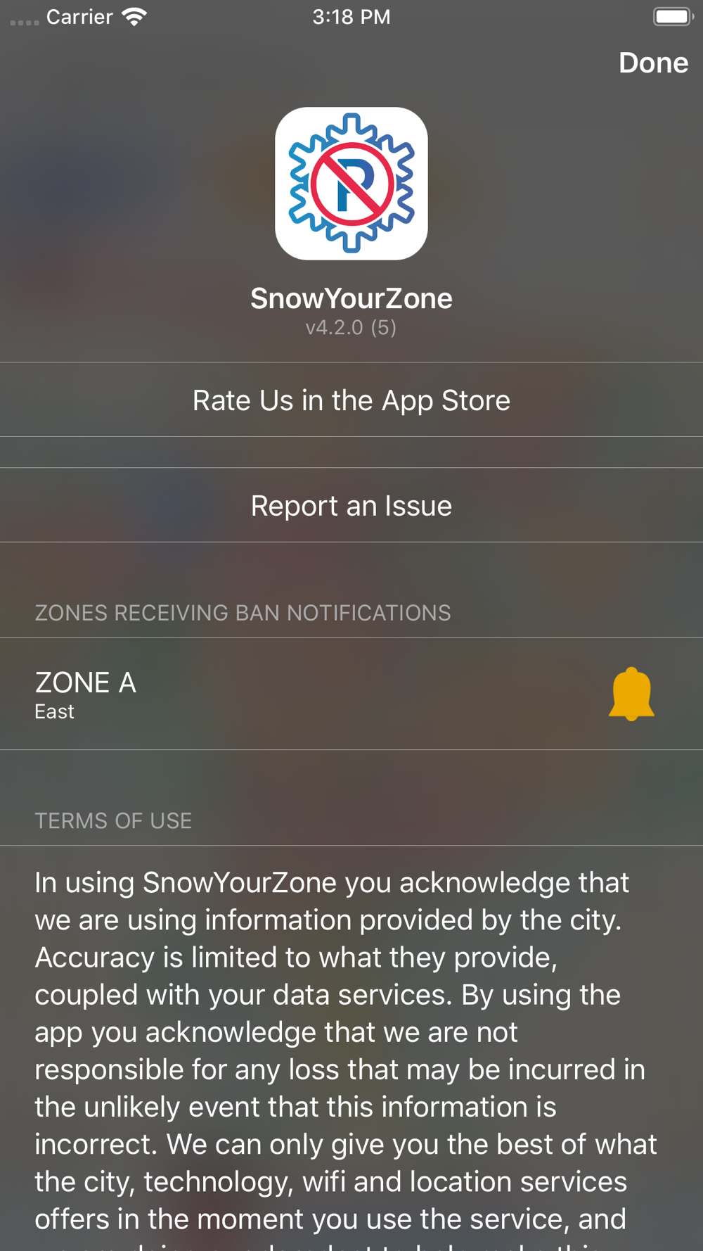 In using SnowYourZone you acknowledge that we are using information provided by the city. Accuracy is limited to what they provide, coupled with your data services. By using the app you acknowledge that we are not responsible for any loss that may be incurred in the unlikely event that this information is incorrect. We can only give you the best of what the city, technology, wifi and location services offers in the moment you use the service, and we are doing our darndest to help make this whole plow-zone-ban system more comprehensive.