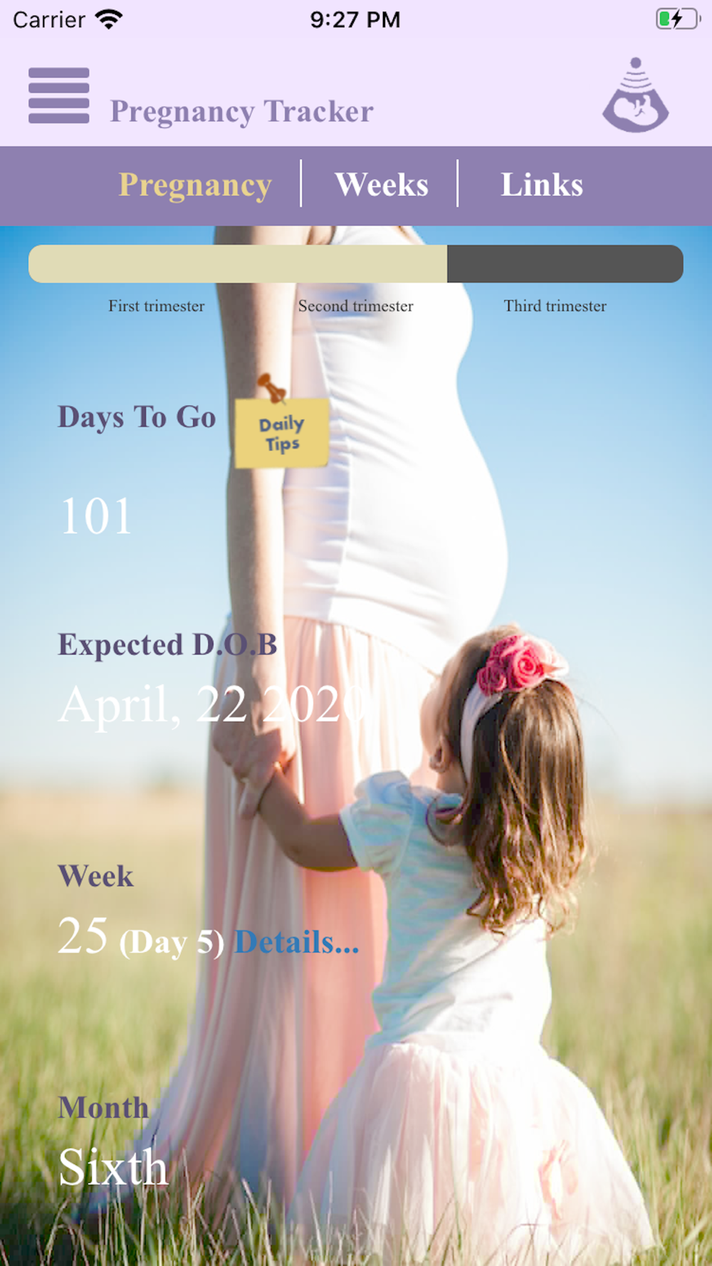 Pregnancy Tracker, is your companion throughout your pregnancy, just go in the desired date to tell you facts about your pregnancy (expected date of birth, the number of days to go in your pregnancy journey, month, week, and more).