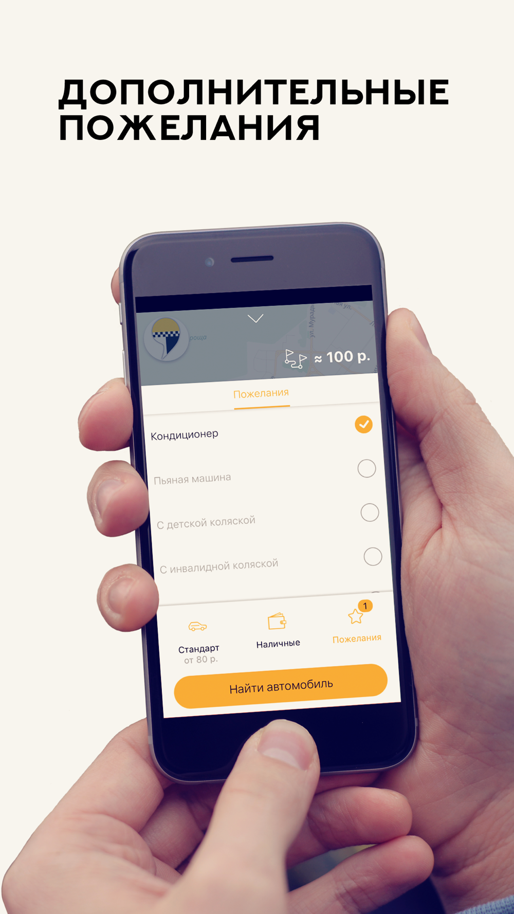 Выбирайте один из тарифов, указывайте дополнительные пожелания к автомобилю, следите за поездкой по интерактивной карте.