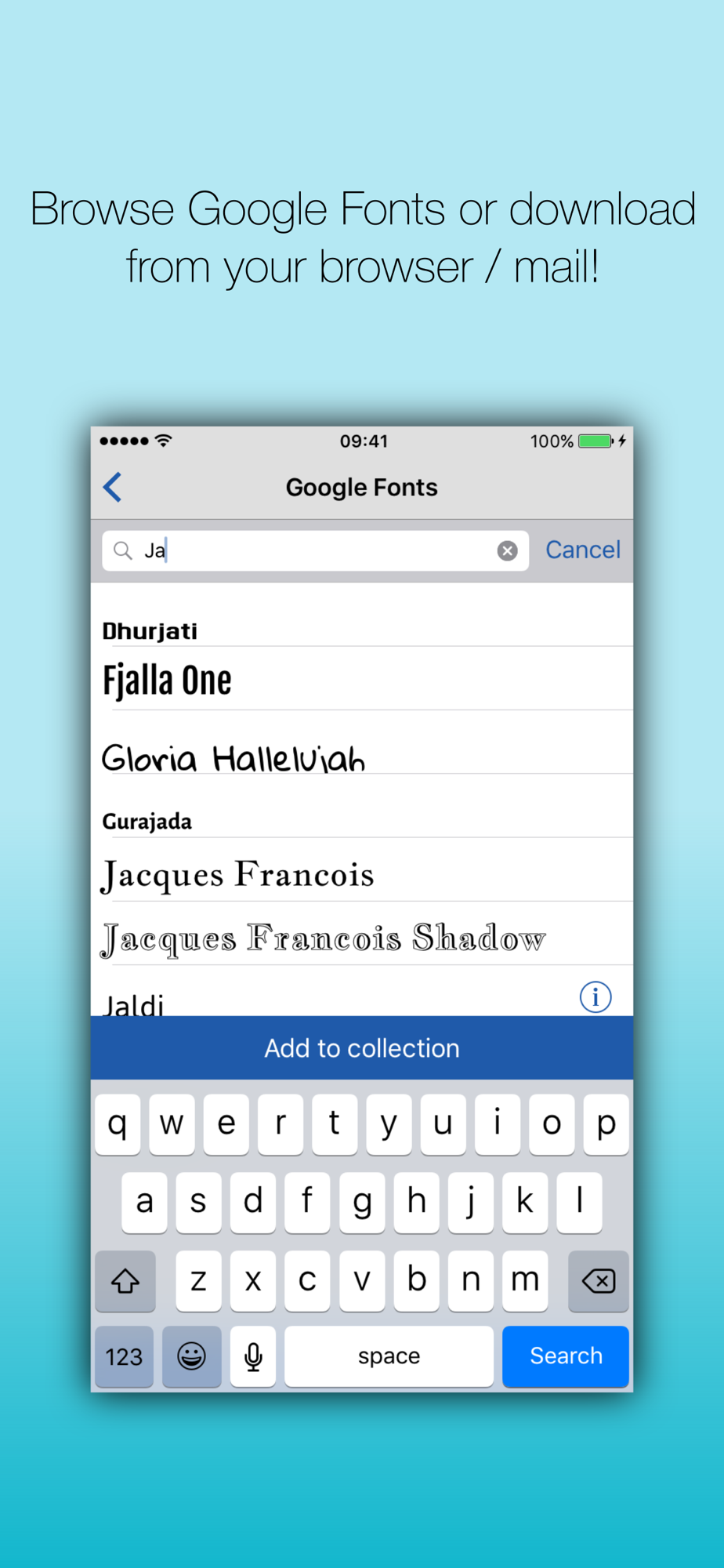 A: Almost any. You can locate .otf and .ttf font files on your Mac or PC, mail them and open in Fonteer. You can download fonts from the internet. You can easily browse Google Fonts from within the app.