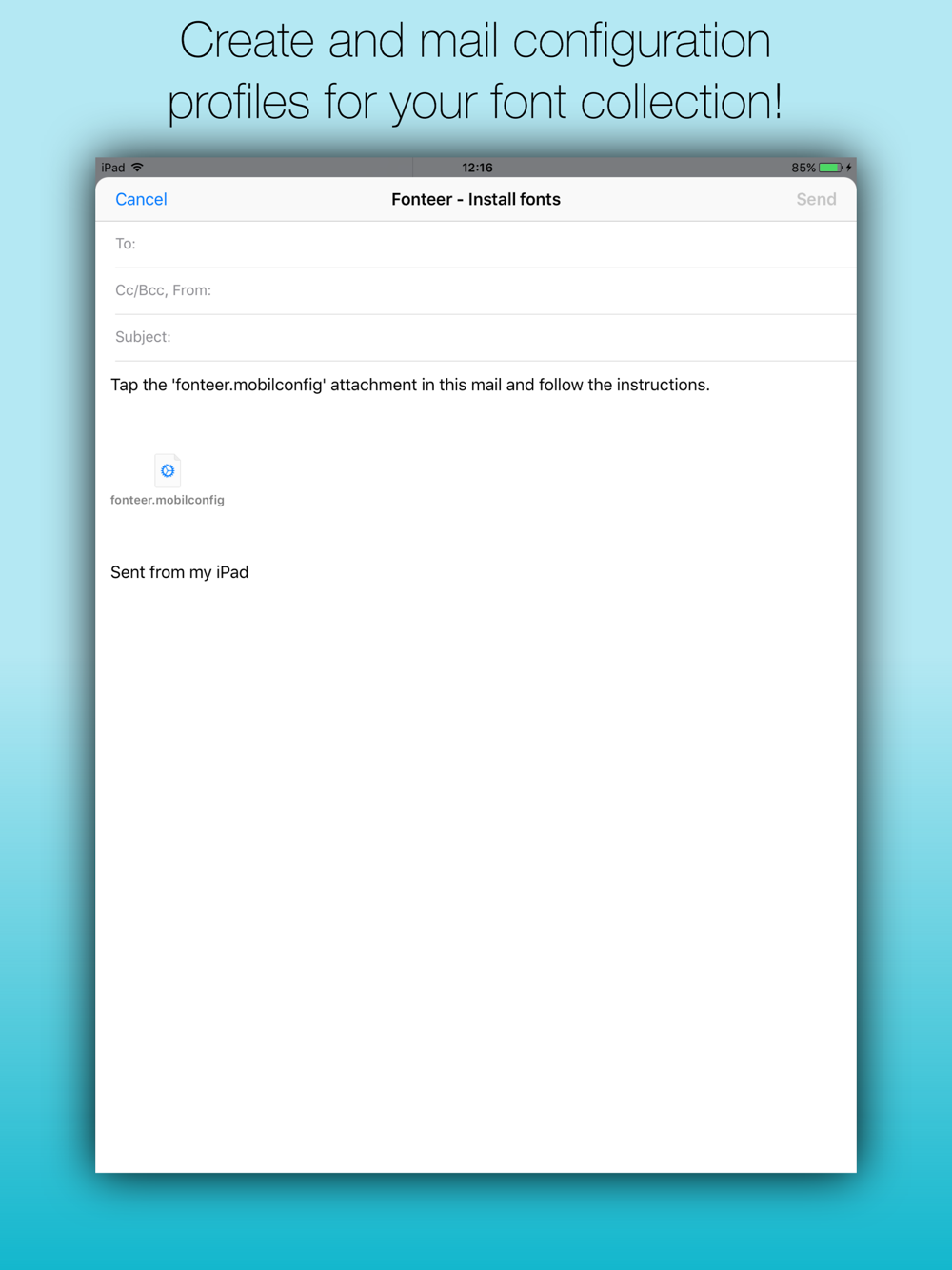 Install OpenType (.otf) or TrueType (.ttf) fonts on your devices! Email the fonts as a configuration profile and install to make the fonts available in any application that allows you to use the system fonts. Compatible with Pages, Keynote, Numbers, Word, Powerpoint, Excel and many other apps!