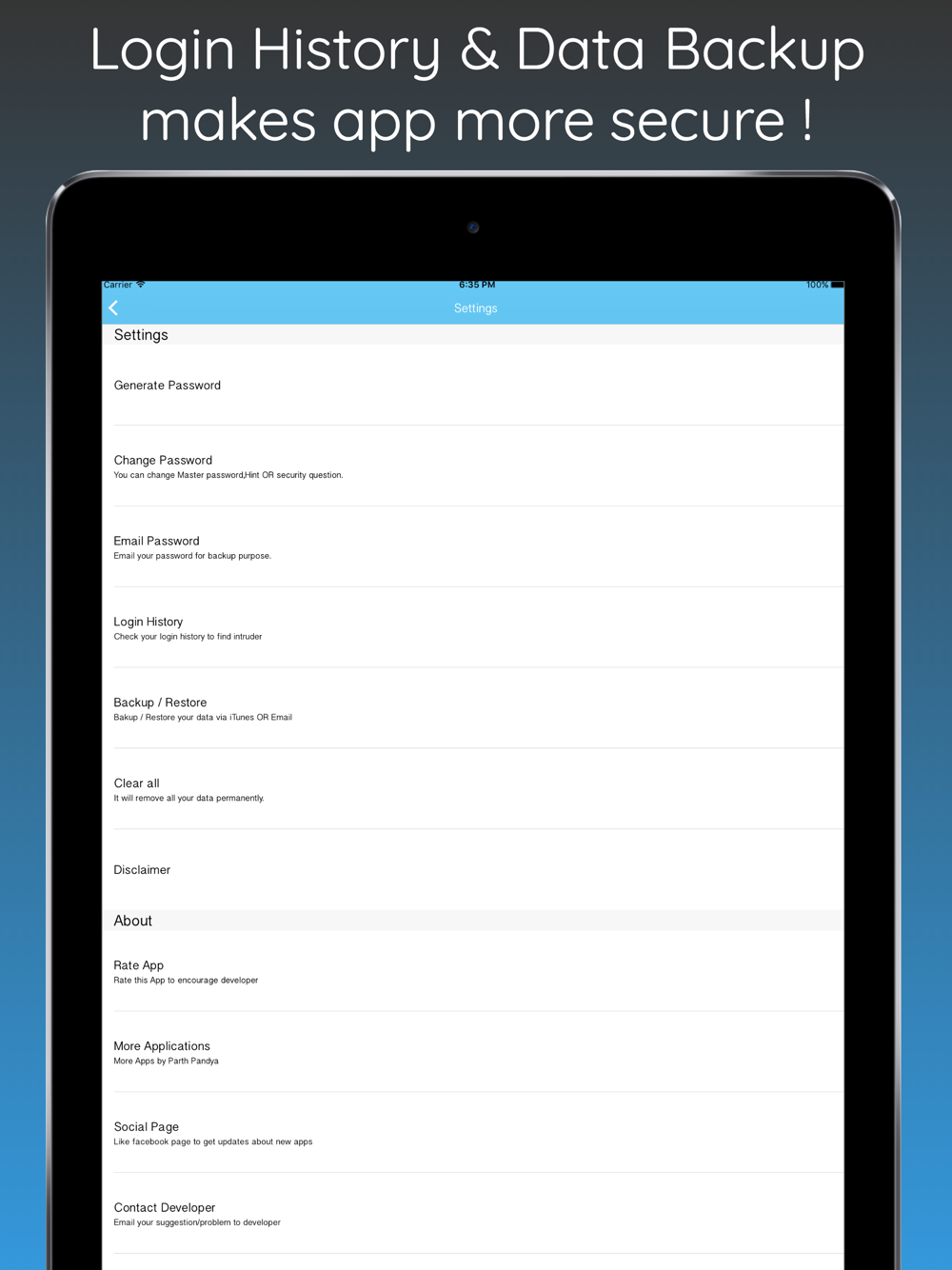 Still struggling to remember multiple passwords? Still suffering from forgetting passwords? Then here is the solution. The design and concept keep your password safely and easy to accessible. With tiny single password you can manage all your passwords in one place SECURE and SAFE !!! Key features of this app are: It uses 256 AES encryption to store data AND it uses local storage of device so, no worry about hacking and internet security.