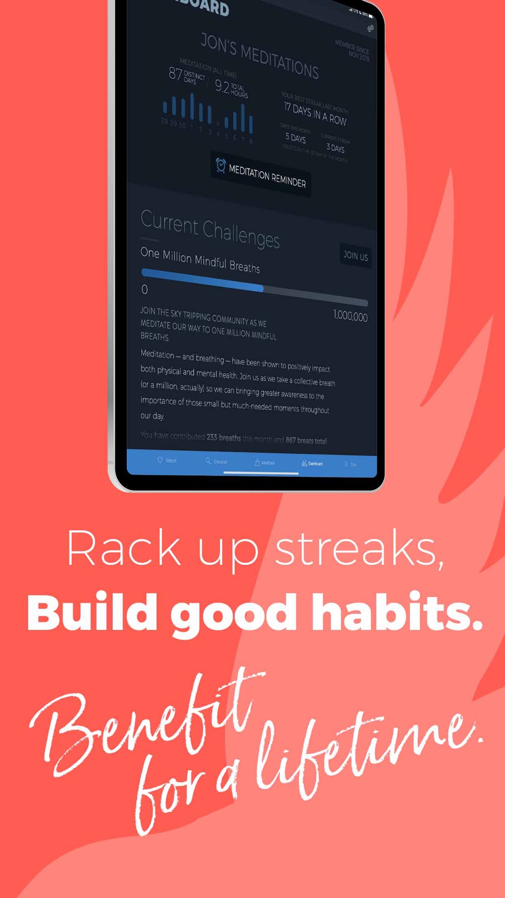 Meditation has been scientifically proven to increase mental sharpness, reduce stress and anxiety, and even improve physical health. Despite having an interest in meditation, most people don't do it for one simple reason: they don't know how. That changes today: as Eckhart Tolle famously said, "A single breath in and out is a meditation." It's that easy! Better yet, you can now supercharge your meditations by breathing to the sights and sounds of the ocean, deep forests, desertscapes, or serene winter views with our new meditation tool. Choose short, focused meditations whenever you need an extra mental boost or moment of relaxation, and rack up streaks by meditating once or more a day. Breathe, enjoy, repeat! Sky Tripping even integrates with HealthKit, recording your mindfulness exercises directly to Apple's Health App.