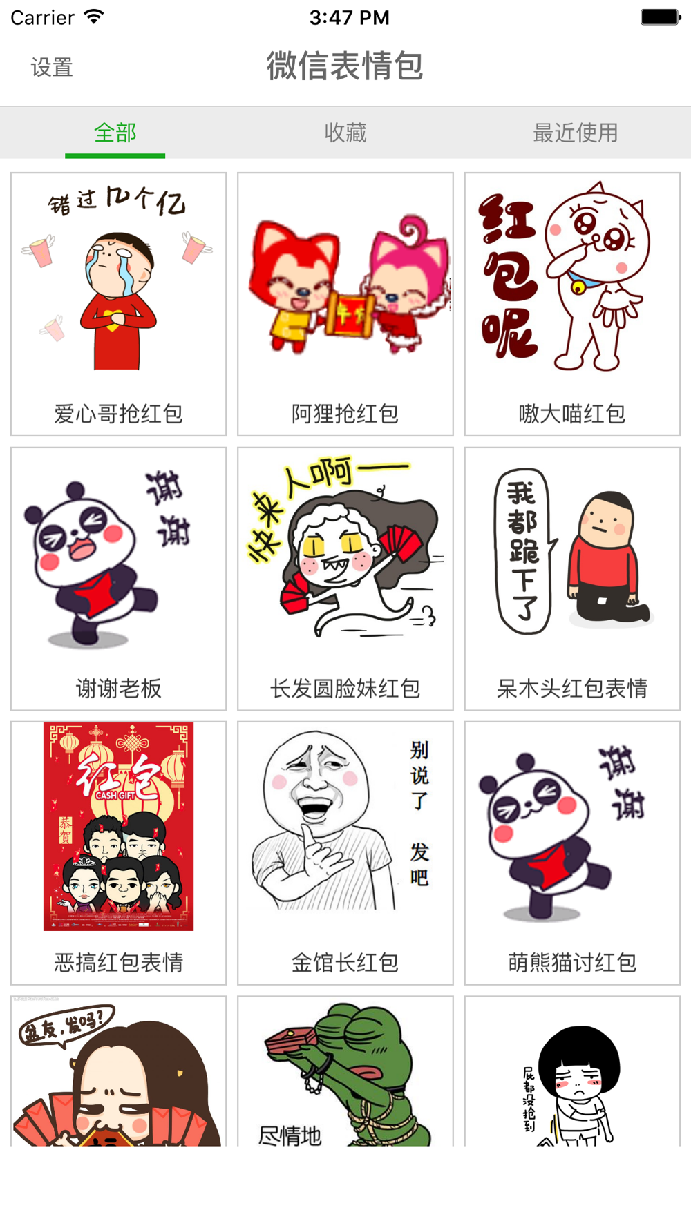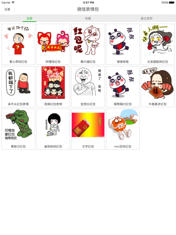 集成了mm豆抢红包,金馆长红包,牛轰轰求红包,长发圆脸妹红包,恶搞红包,阿狸抢红包,萌熊猫讨红包,文字红包,青蛙讨红包,雀斑妹抢红包,爱心哥抢红包 ,呆木头红包表情等表情包。