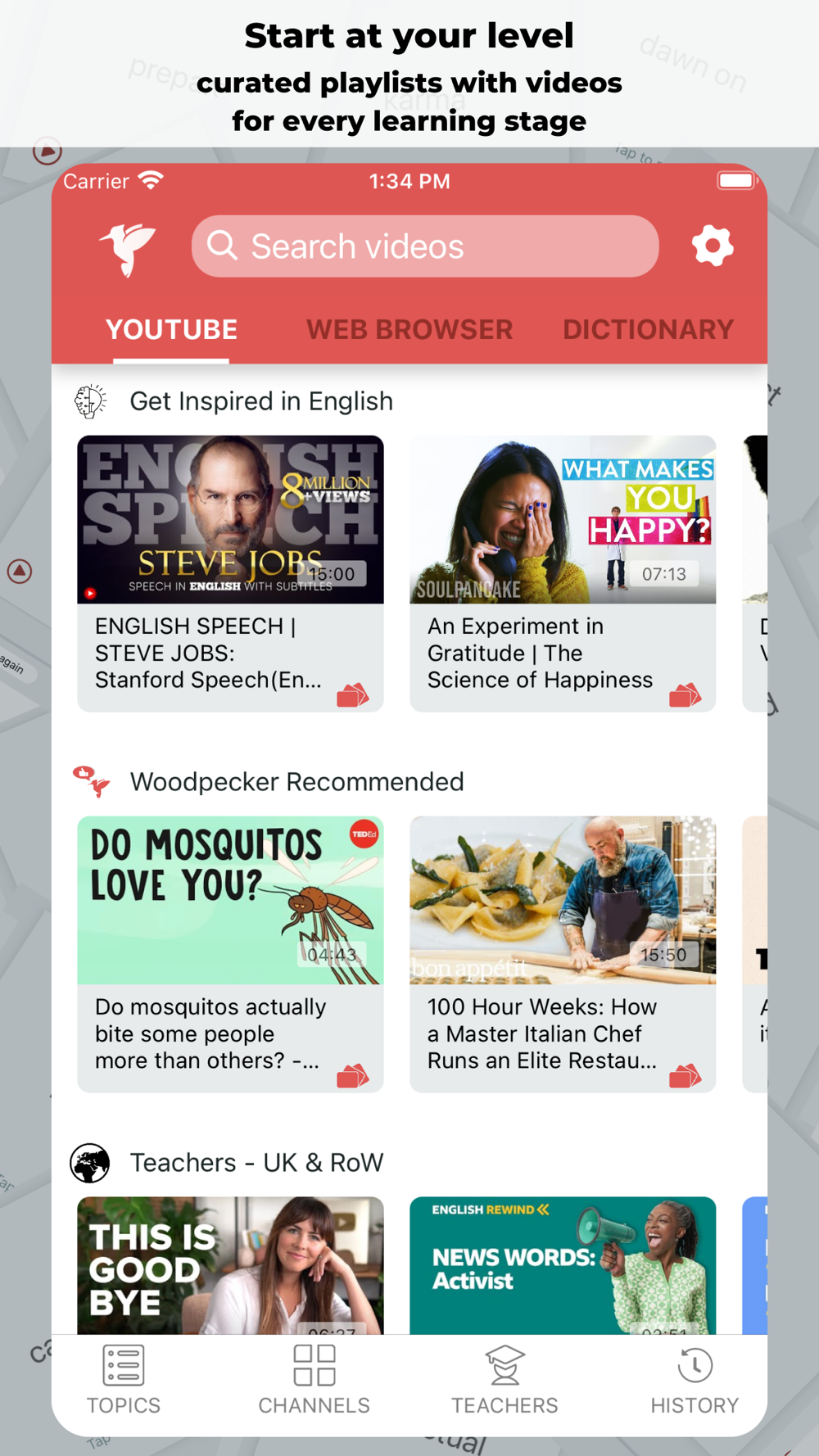 • Woodpecker filters Youtube to show only the videos in the language you’re learning