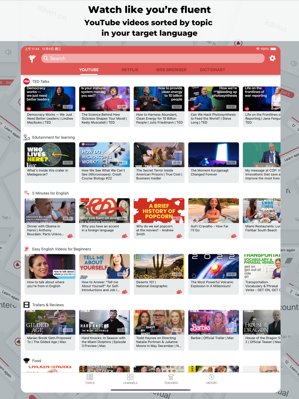 • Discover videos in the language you’re learning. Explore by topic, channel name, or view videos by popular teachers on Youtube