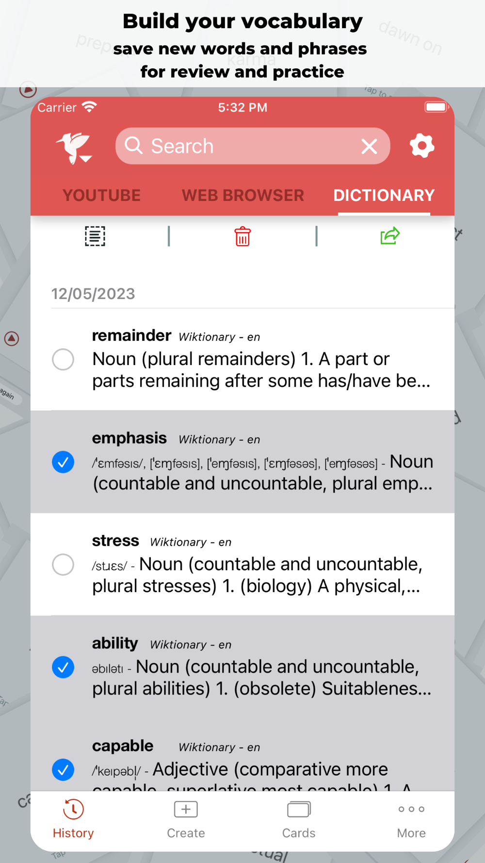 • See all the words and expressions you’ve looked up in your word history; review them and practice with pronunciations
