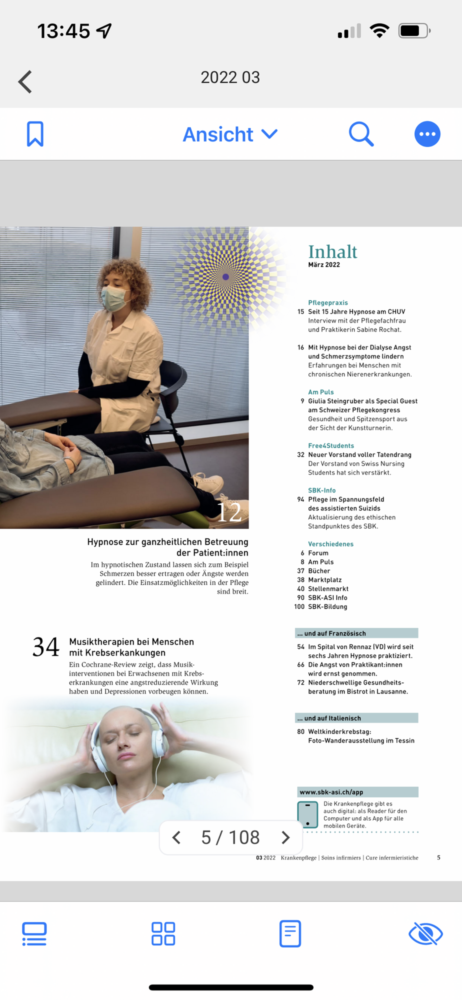 Lesen Sie mit der SBK-ASI-App die Zeitschrift Krankenpflege auf allen Ihren mobilen Geräten. Die grösste Schweizer Fachzeitschrift für professionelle Pflege bietet Fachartikel zu Themen wie Akut- und Langzeitpflege, Psychiatriepflege, Kinderkrankenpflege, Gesundheitspolitik und vieles mehr. Finden Sie ausserdem die aktuellen Informationen des Schweizer Berufsverbands der Pflegefachfrauen und Pflegefachmänner, der die Interessen der Pflegefachpersonen in Schweiz gegenüber Politik und Behörden vertritt.