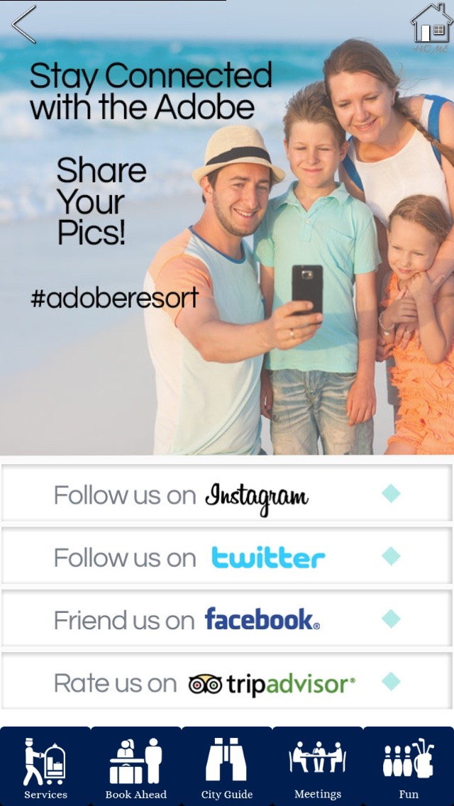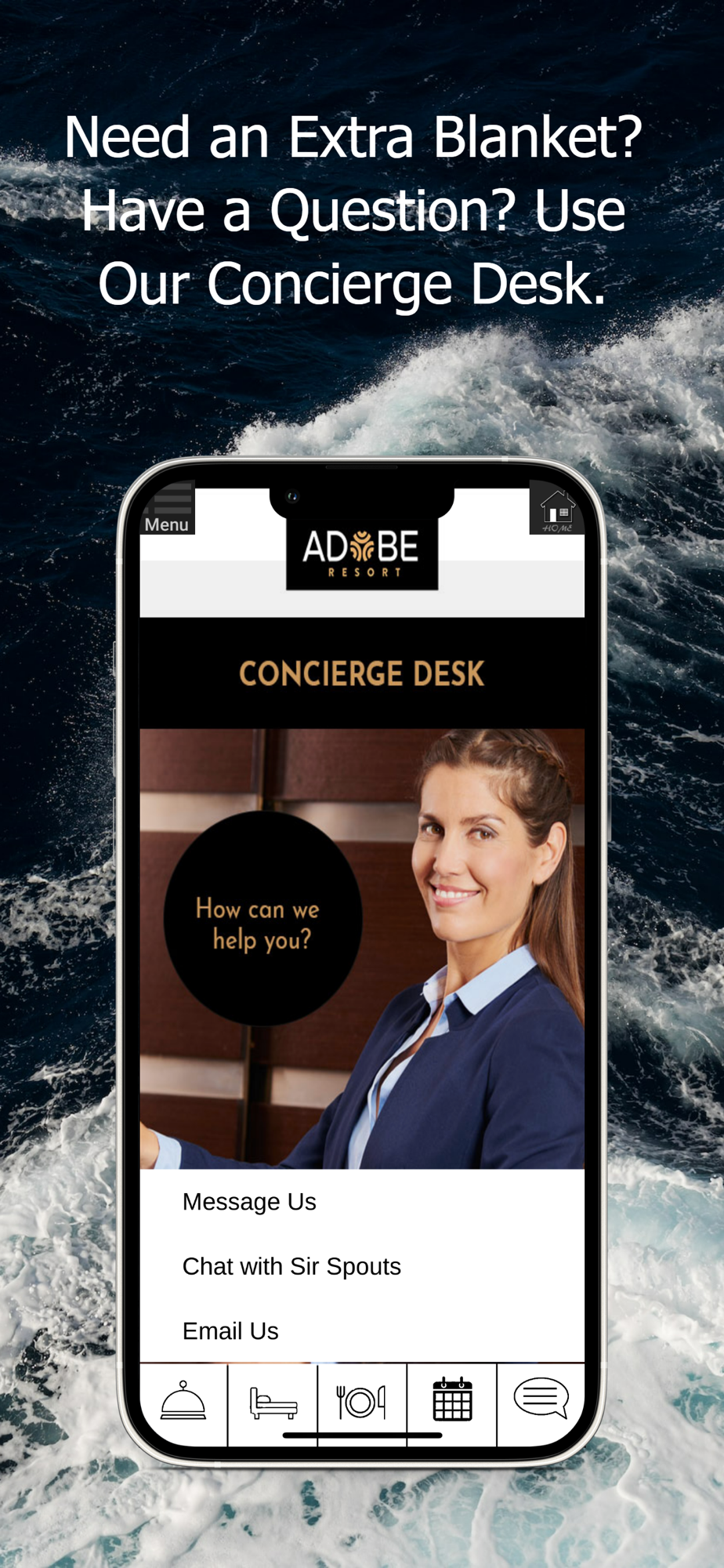 Welcome to The Adobe Resort, located at the magnificent ocean’s edge! All Your Hotel EZ Links are at your fingertips. Use our Adobe Resort App to explore resort amenities, make dinner reservations, order delicious food online, check out our restaurant menus and daily specials, download a floor map, book your next room or meeting/wedding space, connect with us on social media, tell us how we did, message us for a blanket or pillow, check tide tables, and talk to our 24/7 Chatbot Sir Spouts. Say "Hi" to Sir Spouts and watch him spout. Ask him to see the sunset.