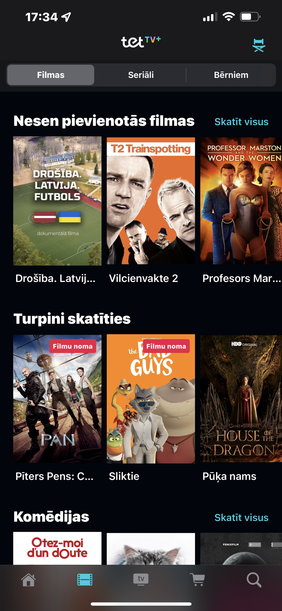 Filmas un seriāli: iespēja skatīties populārākās filmas, seriālus un bērnu raidījumi bez reklāmas pauzēm. Saturs pieejams latviešu un citās valodās.