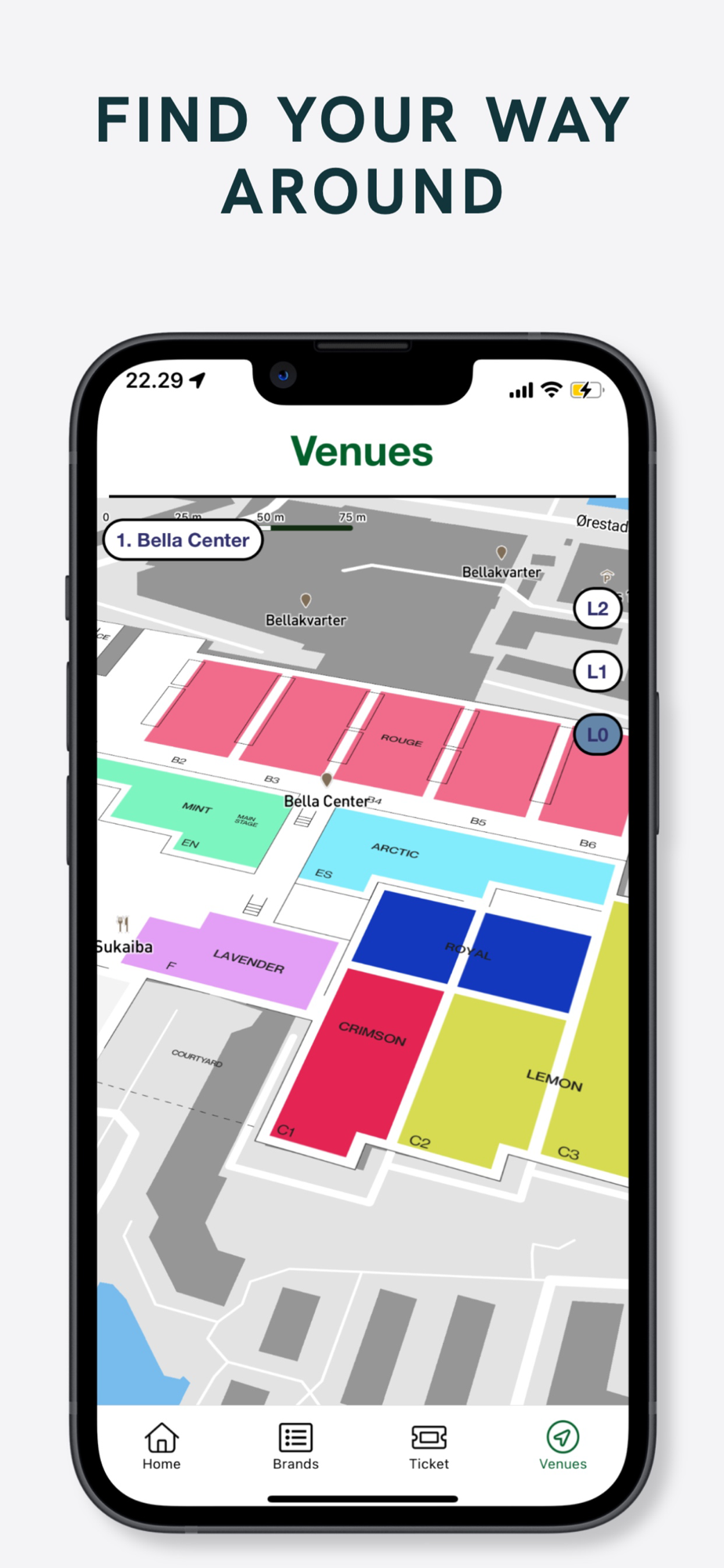 Tap on the search field and write or select a Brand name to find their location within the venue.