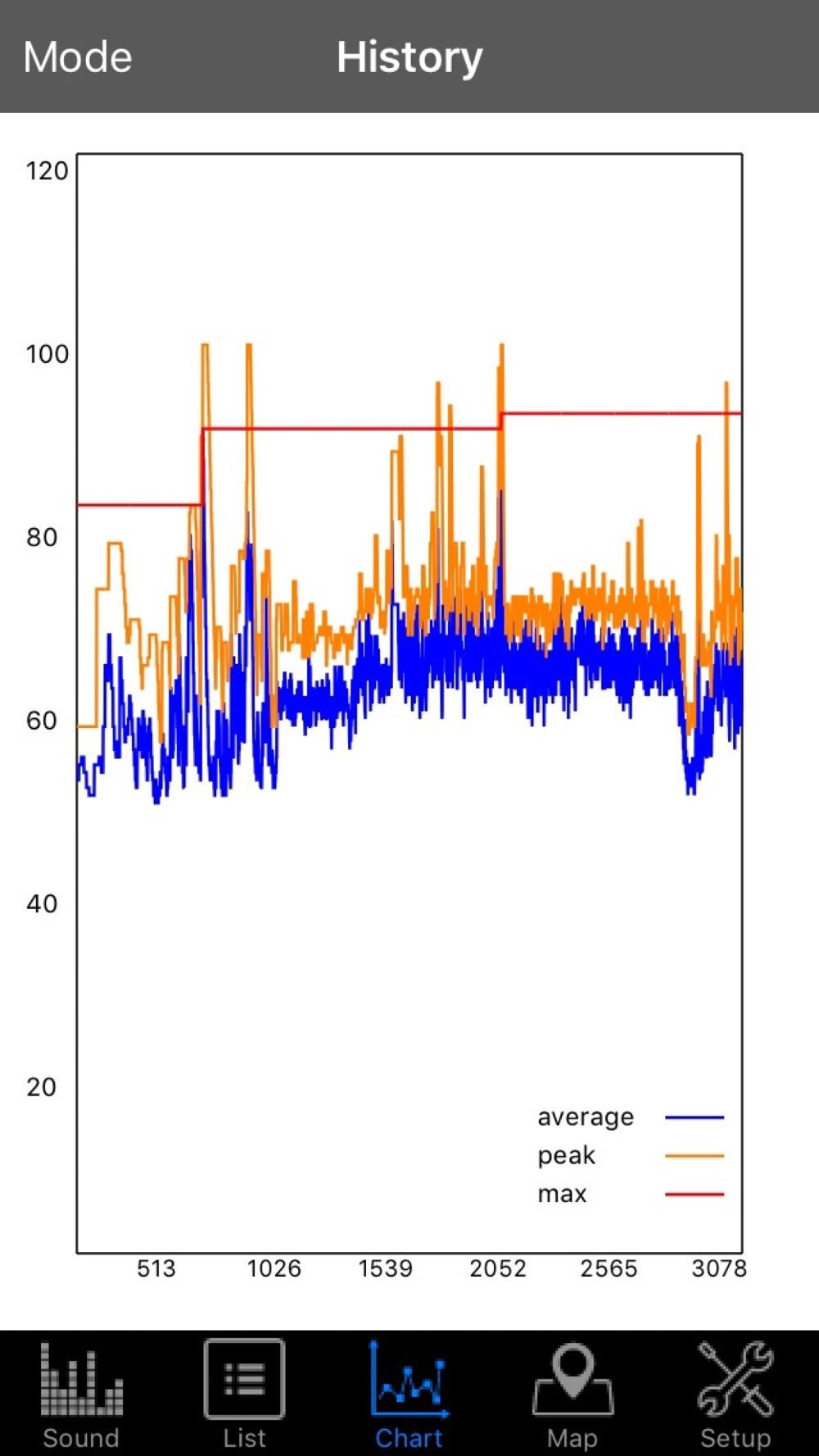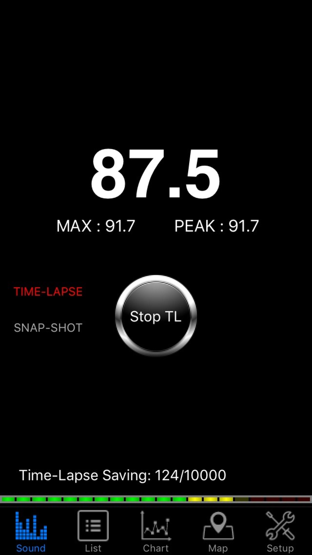 - Save time, name, GPS Location, Average, Peak, Max of sound power.