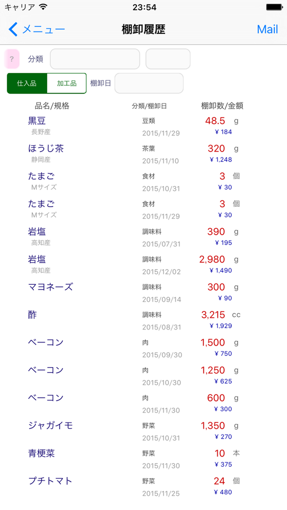 品名、仕入単位/金額・仕入先、使用単位/換算数・歩留りまたは入数、メモ