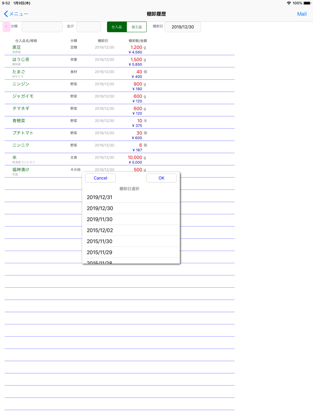 仕入品・加工品の棚卸履歴を照会します。(品目、棚卸日、棚卸数、棚卸金額)