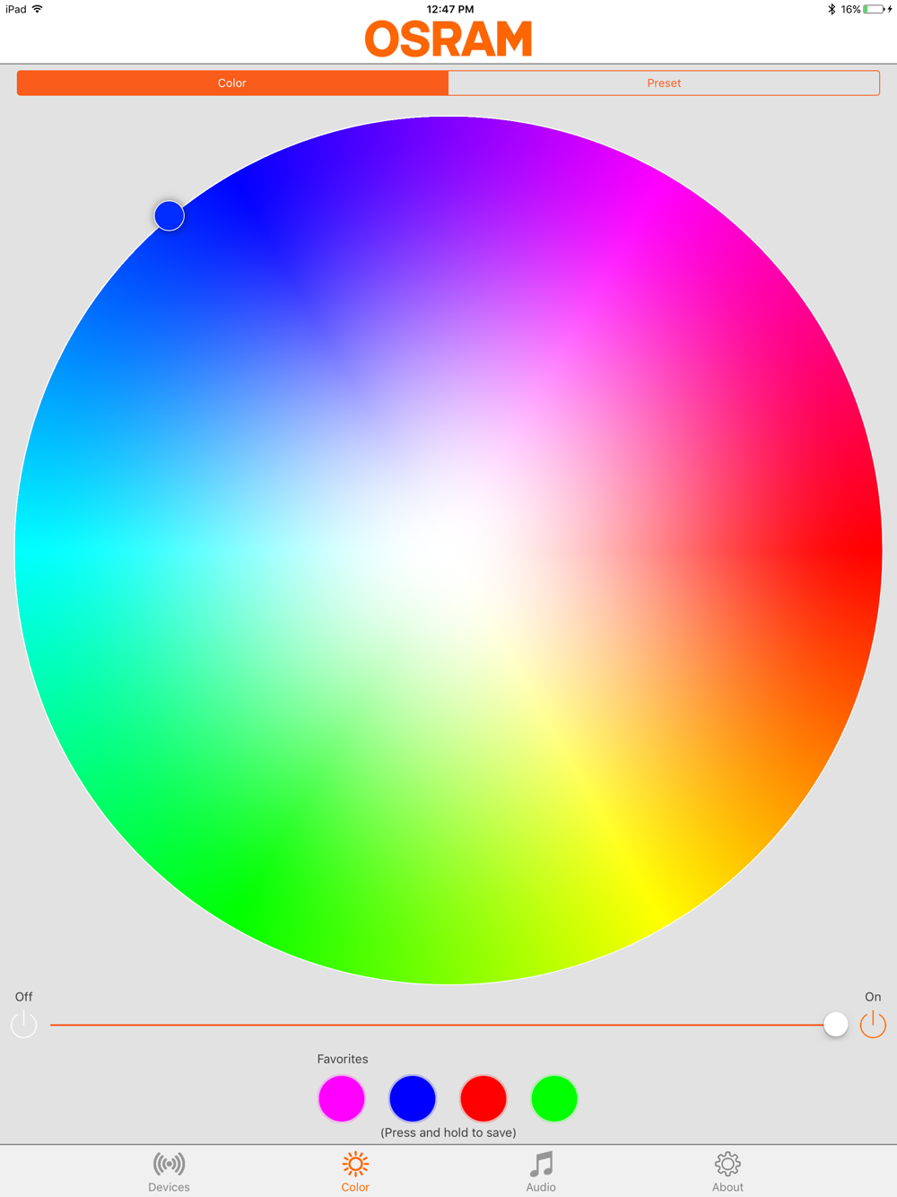The LEDambient® CONNECT App from OSRAM allows a control of OSRAM LEDambient CONNECT car lighting products. The communication works very easy via Bluetooth LED controller. The app allows for quick access to color settings of the LEDambient CONNECT PULSE, HYBRID or TUNING LIGHTS devices. Thus, you can adjust the interior and exterior lighting of your vehicle quickly and individually.