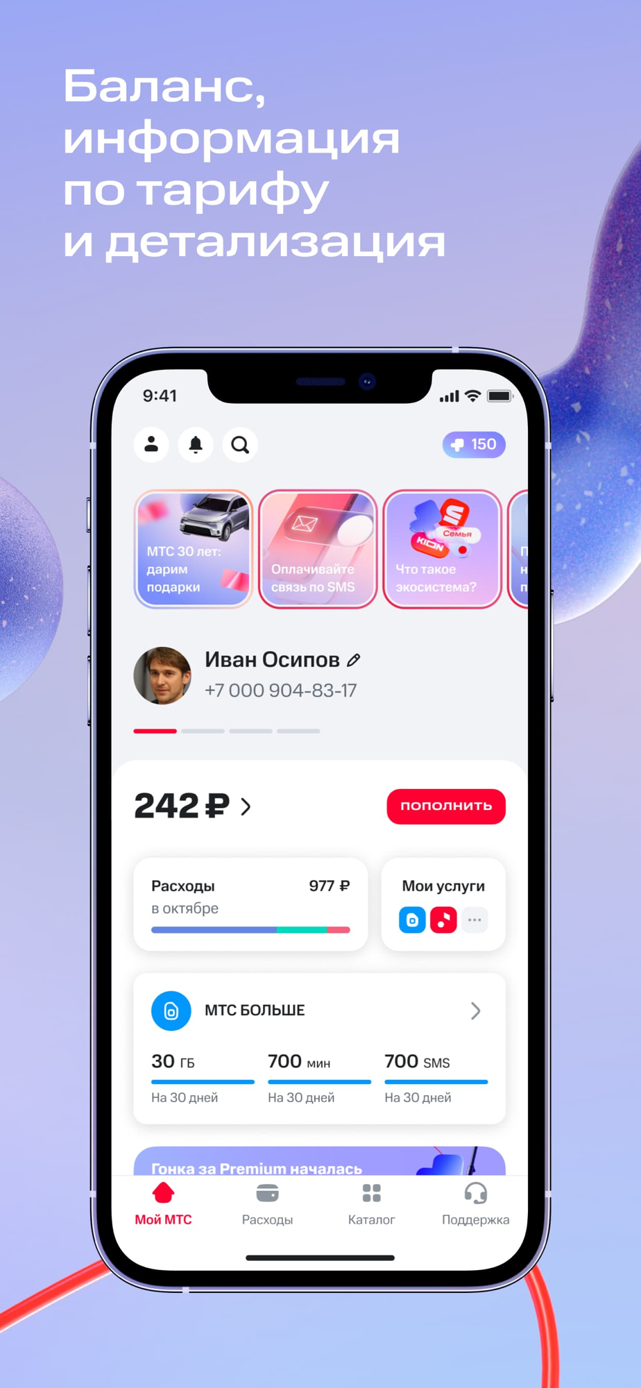 Добавляйте свои мобильные номера, умные устройства, домашний интернет и ТВ и номера своих близких — так у вас будет быстрый доступ ко всей информации о них. А переключаться между аккаунтами просто — на главном экране привычным свайпом.