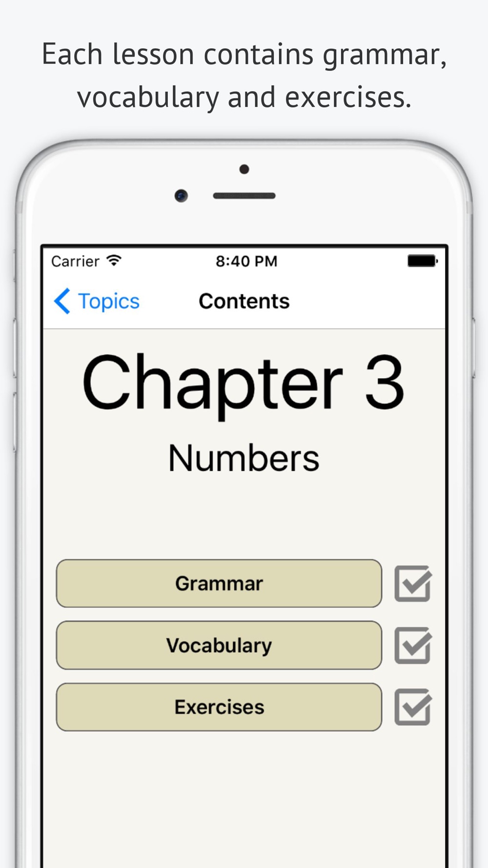 ◉ Each lesson contains grammar, vocabulary and exercises.