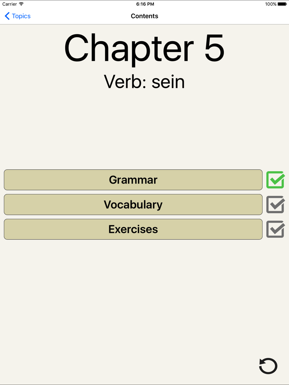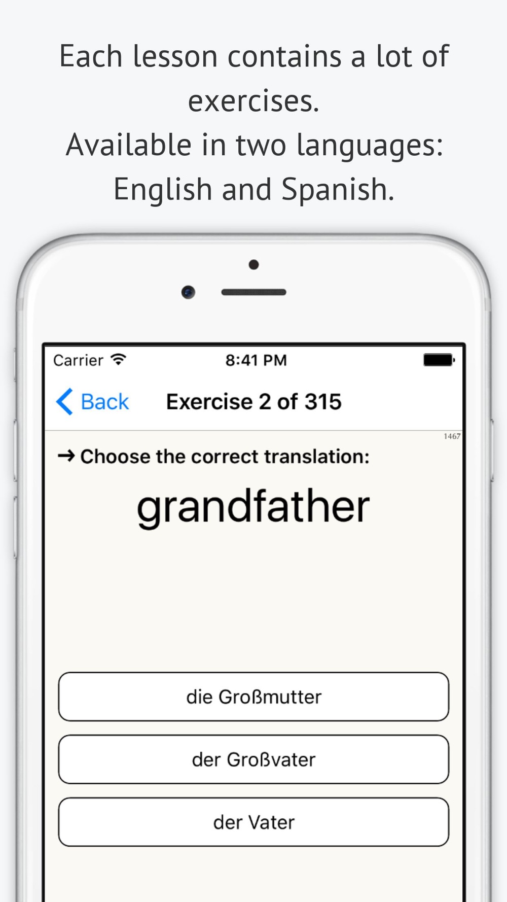 Thanks to thousands of exercises, almost 7000, you can learn the 500 words of basic vocabulary. The exercises stimulate you to read, listen and write many times each word. You will learn the numbers, the weekdays, the time, the conjugation of the verb "sein" (to be) and everything required to construct simple sentences helping you in your daily live.