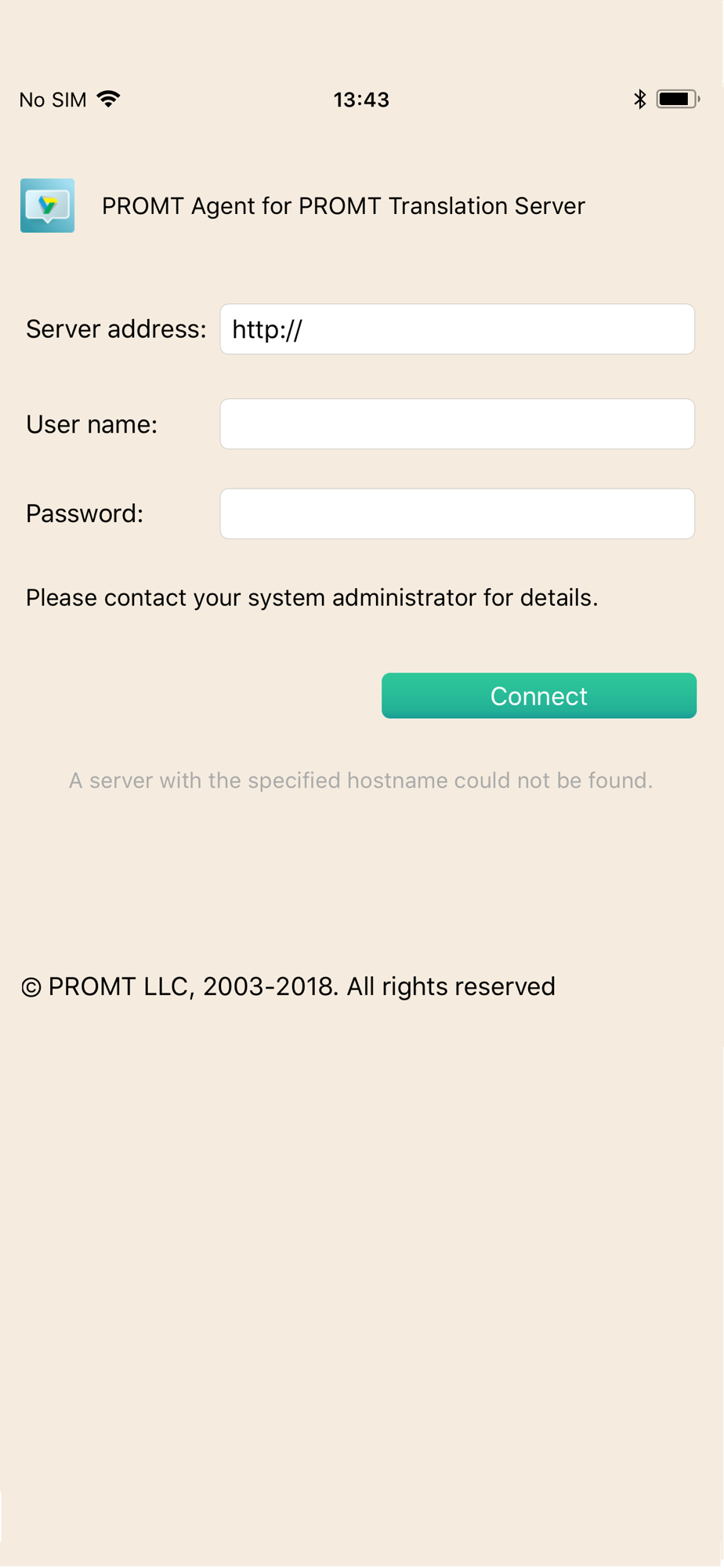 To work with the application, INTERNET IS REQUIRED to connect to PROMT Neural Translation Server.