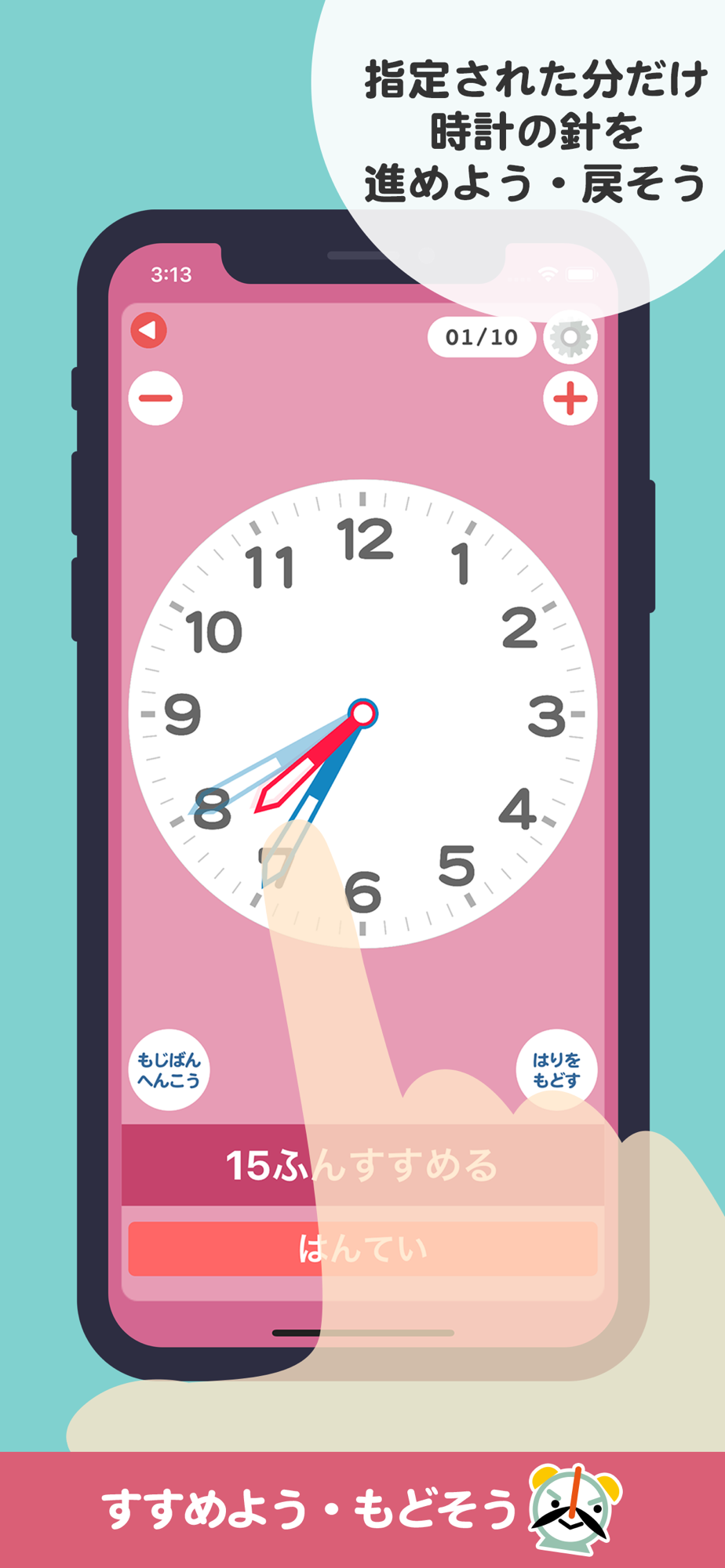 文字盤の針を、指定の時間進めたり戻したりするクイズです。
