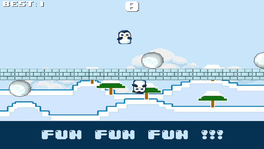 You and your penguin buddy have to flap and jump to stay alive for as long as you can!!! Tap the screen to jump and avoid the snow rocks. If the snow rocks hit you, you and your penguin birdie buddy die. Don't let the snow rocks crush you!!