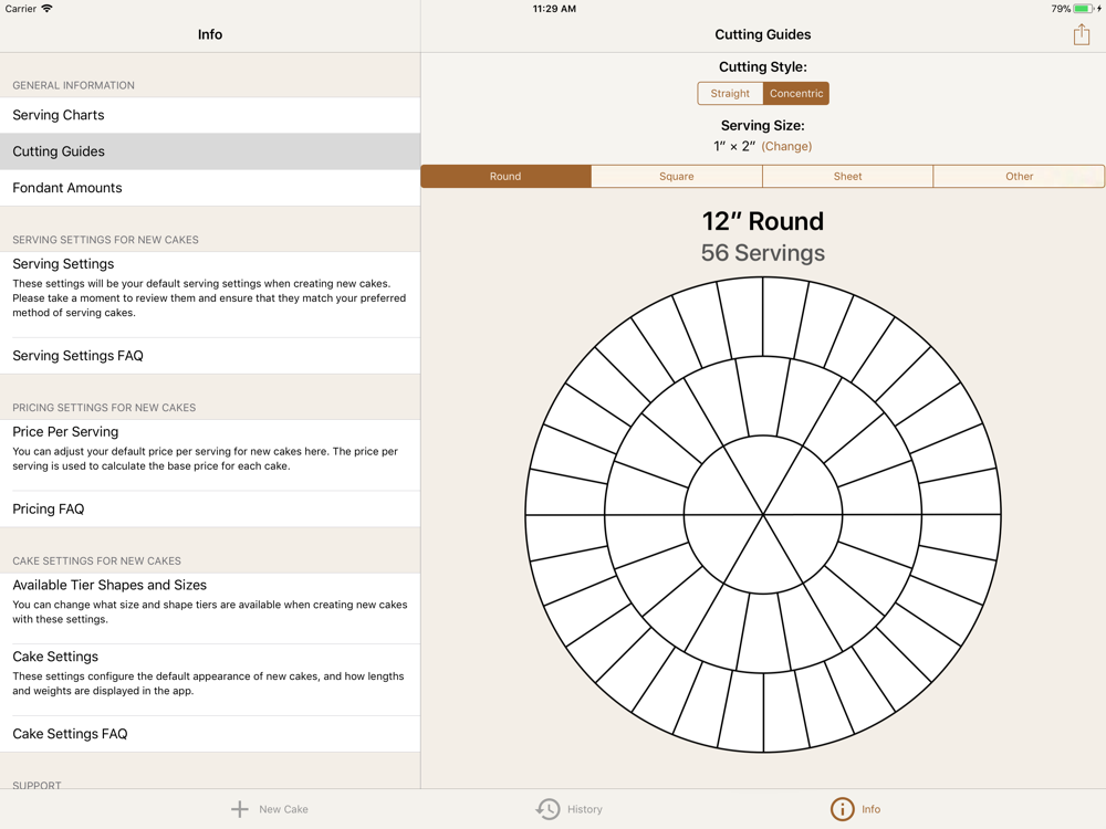 • View and share cutting guides for all of your cakes in either Straight-Cut, or the more traditional Concentric-Cut styles