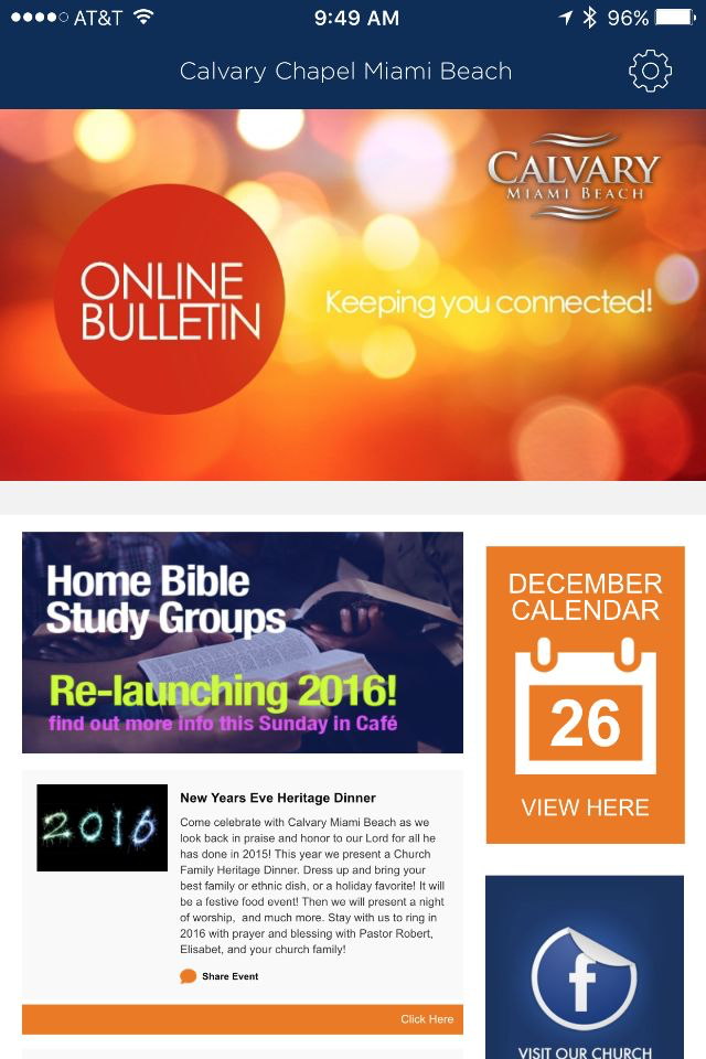 Use the Calvary Miami Beach app to stay connected with weekly bulletins, calendar, video page, and more! Register for events and pay through the app or give online. Read the embedded Bible. For over 2o years Calvary Miami Beach has been "Tearing down the works of darkness, building up the Kingdom of God, and planting the Word of Truth."