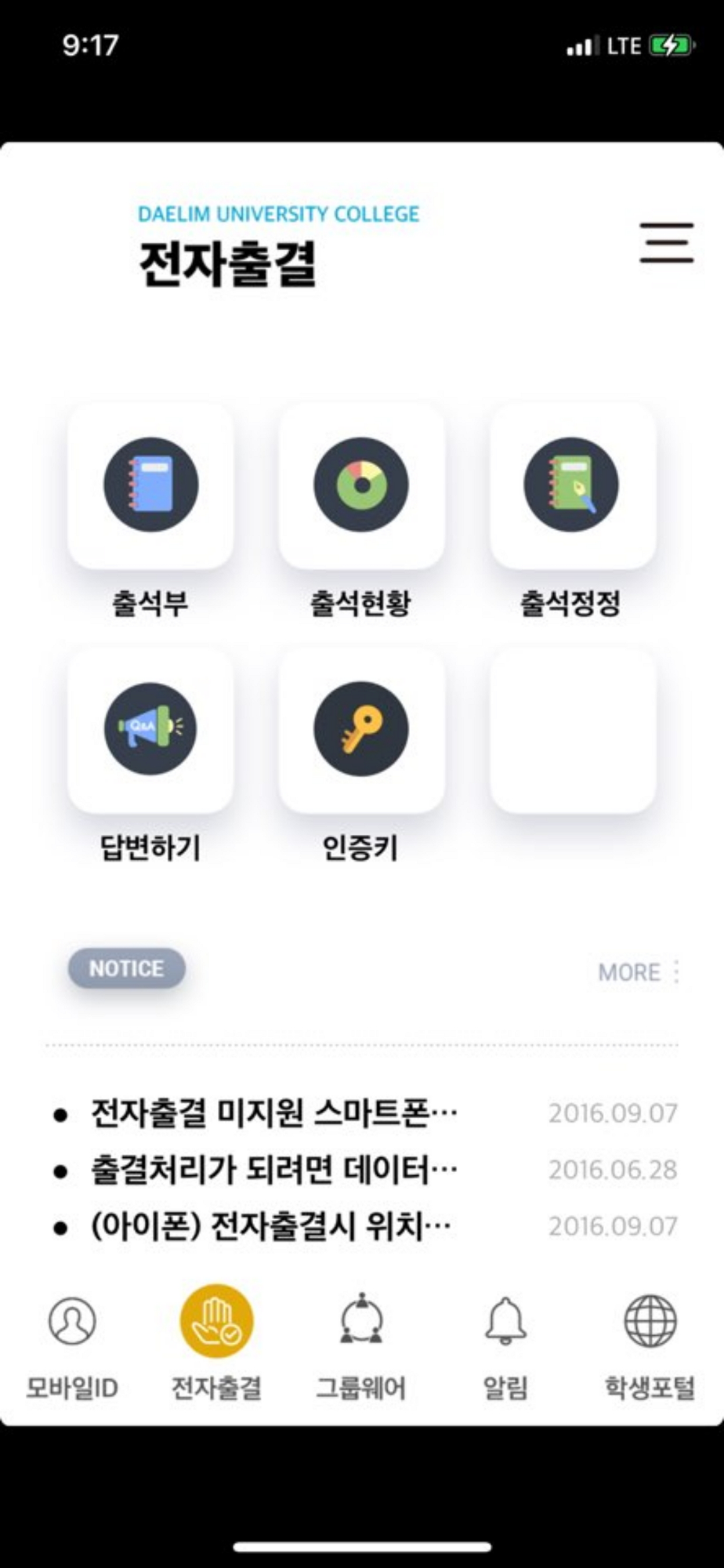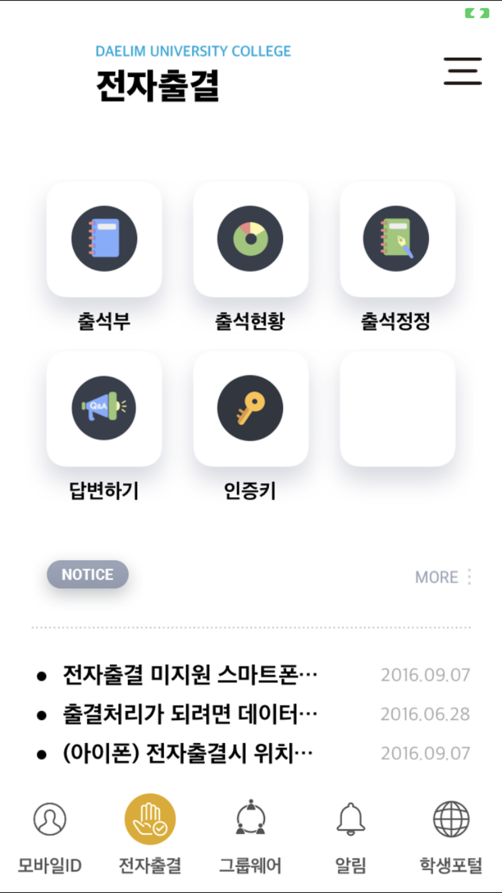 - 출결 기능 : 강의 시간에 모바일 단말기로 출결