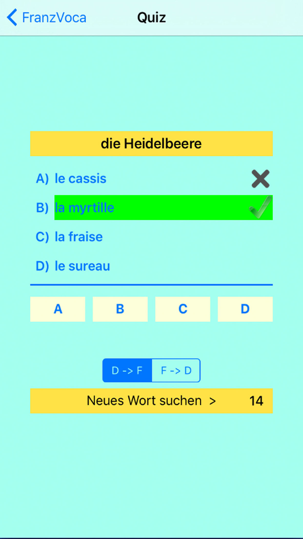 Gut geeignet zum Lernen, Auffrischen und Repetieren von Franösisch Vokabeln. Dazu ein Quiz mit diesem Wortschatz. Drittens eine Liste zum selber Einrichten: Eigene Wörter hinzufügen, bearbeiten und löschen. "Meine Liste" wird als persönliches Vokabular gestaltet und den eigenen Bedürfnissen angepasst.