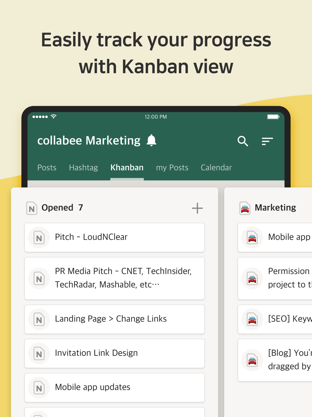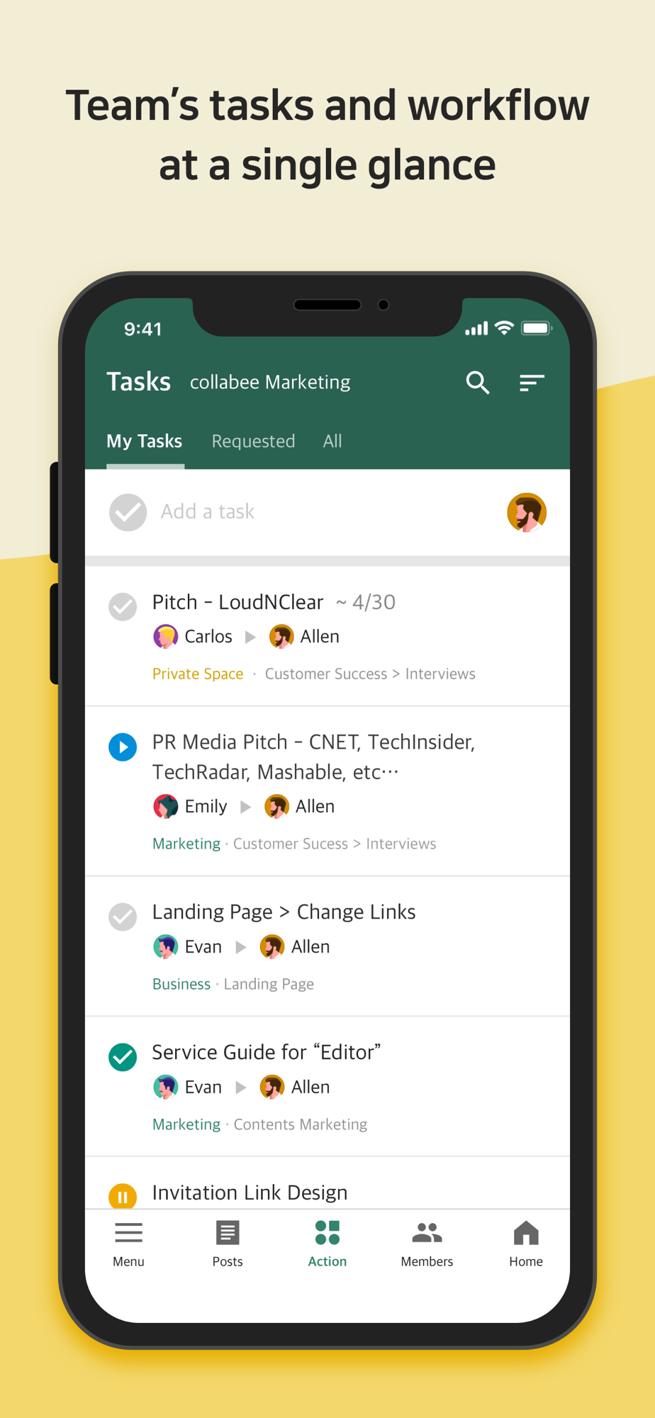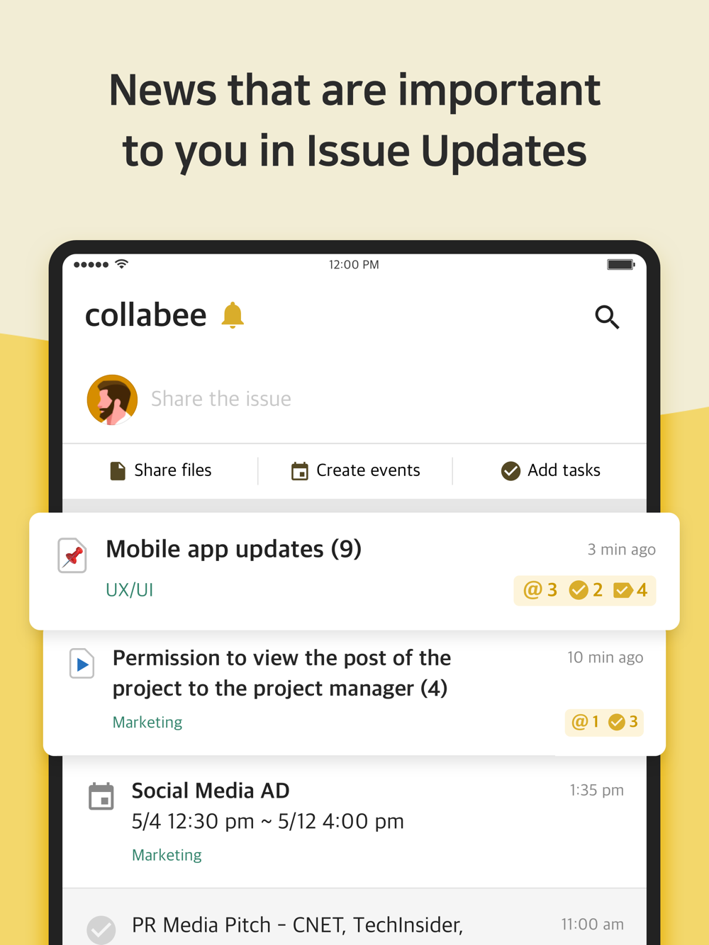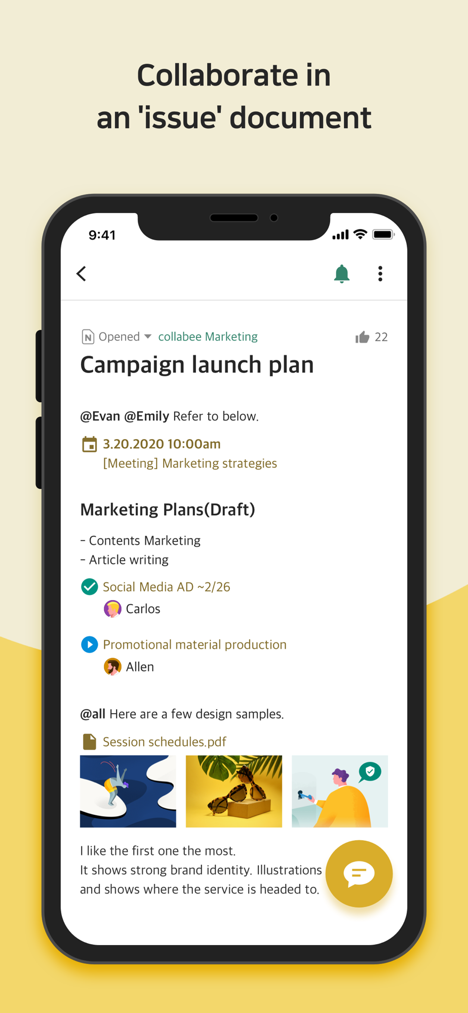 Assign tasks, share files and feedbacks, and communicate with your team in just one page. With Collabee, you know your how far your project has progressed and how active your team is being involved. You can co-author and co-edit an issue, a collaborative document, and mention your coworkers or share tasks, decisions and files. Each step your team takes to get works done will be shown in the comment section, allowing anyone to follow up with the workflow at a glance.