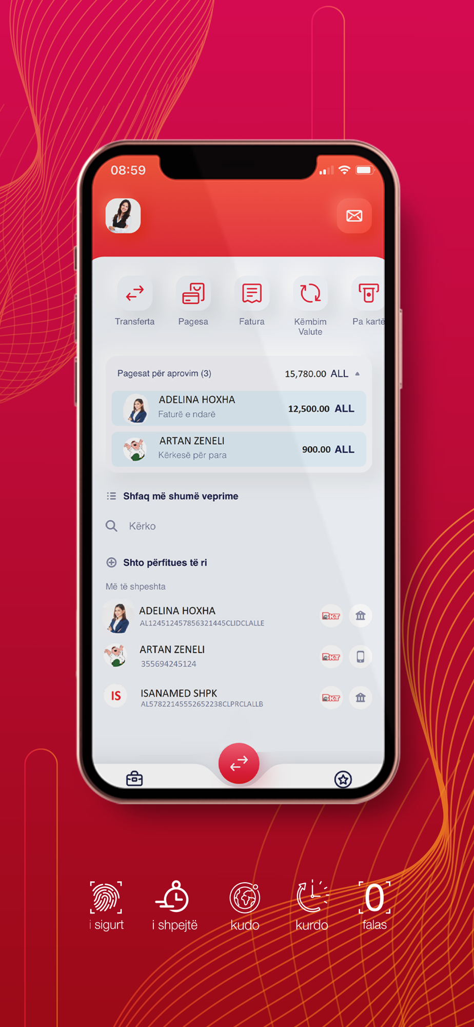 By using BKT Smart, you can be informed and make payments about your accounts, credit cards or your utility bills. You can use electronic top up service for the needed Mobile Operator even direct by your phone contacts. You can transfer money between your accounts, toward BKT accounts, or toward accounts in other banks operating in Albania. You can open new current accounts or saving account and you can perform exchange. You can open a new deposit or can liquidate an existing one.
