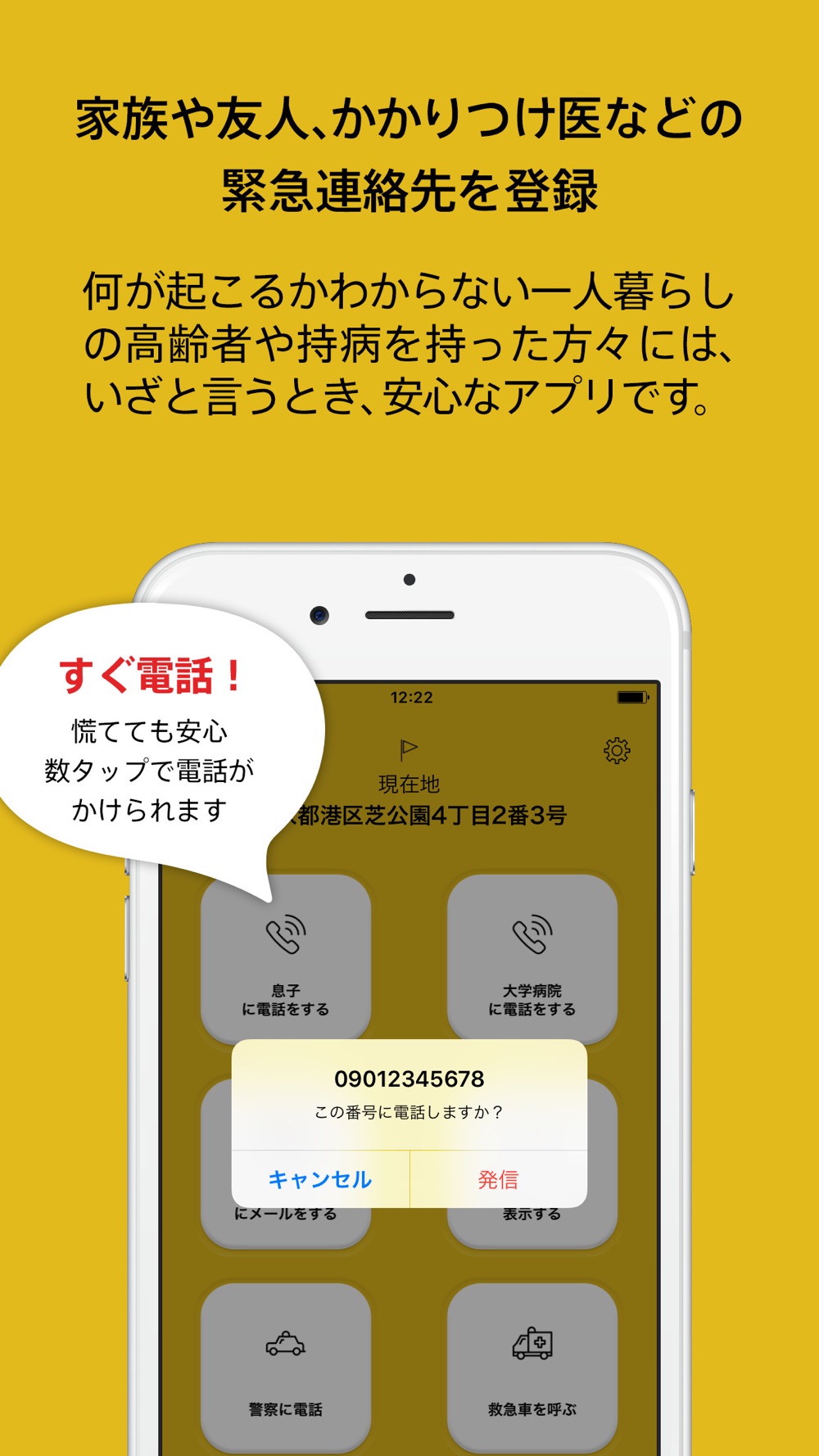 高齢者に多い「スマホの機能が多すぎて使えない」という悩みを解消し、“緊急時に使える機能”を簡単に使えるアプリです。