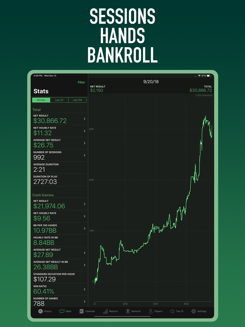 The app shows you all the key statistics you want to know about your game. You’ll finally exactly know how much you win, how much your hourly rate or BB/100 are, and much, much more stats at your disposal!