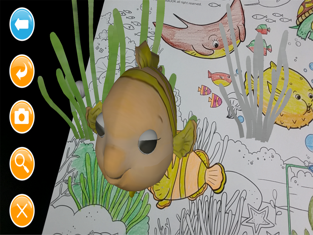 2. 색칠한 친구를 '컬러링쇼'-바다속 친구들 앱화면에 비춰 보세요.