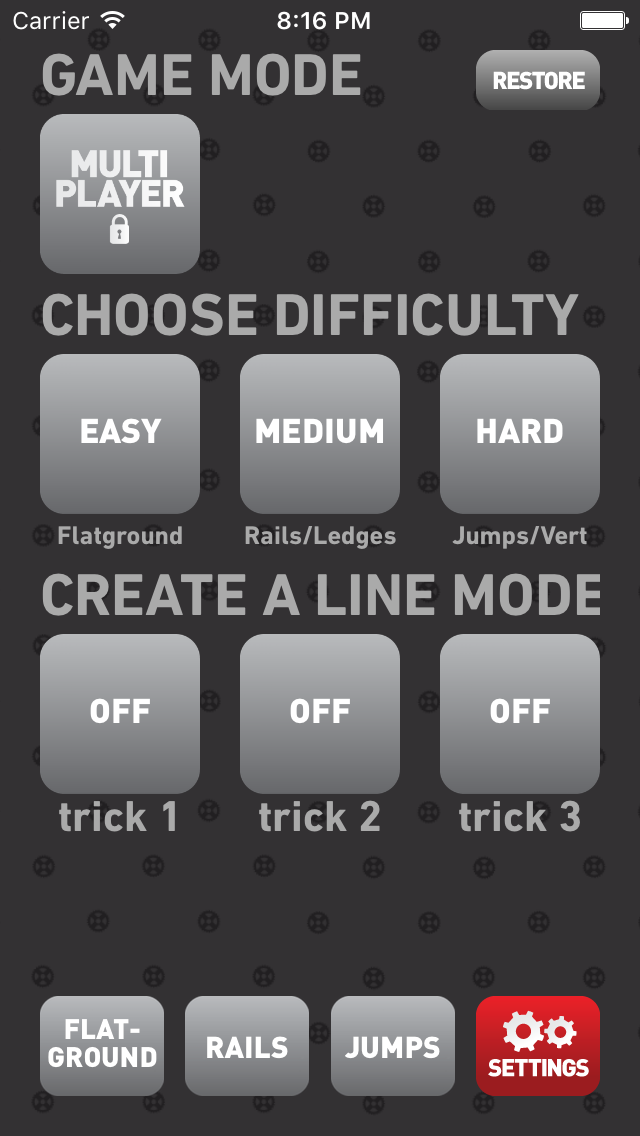 - Easy, Medium and Hard Mode Settings for flatground, rails,