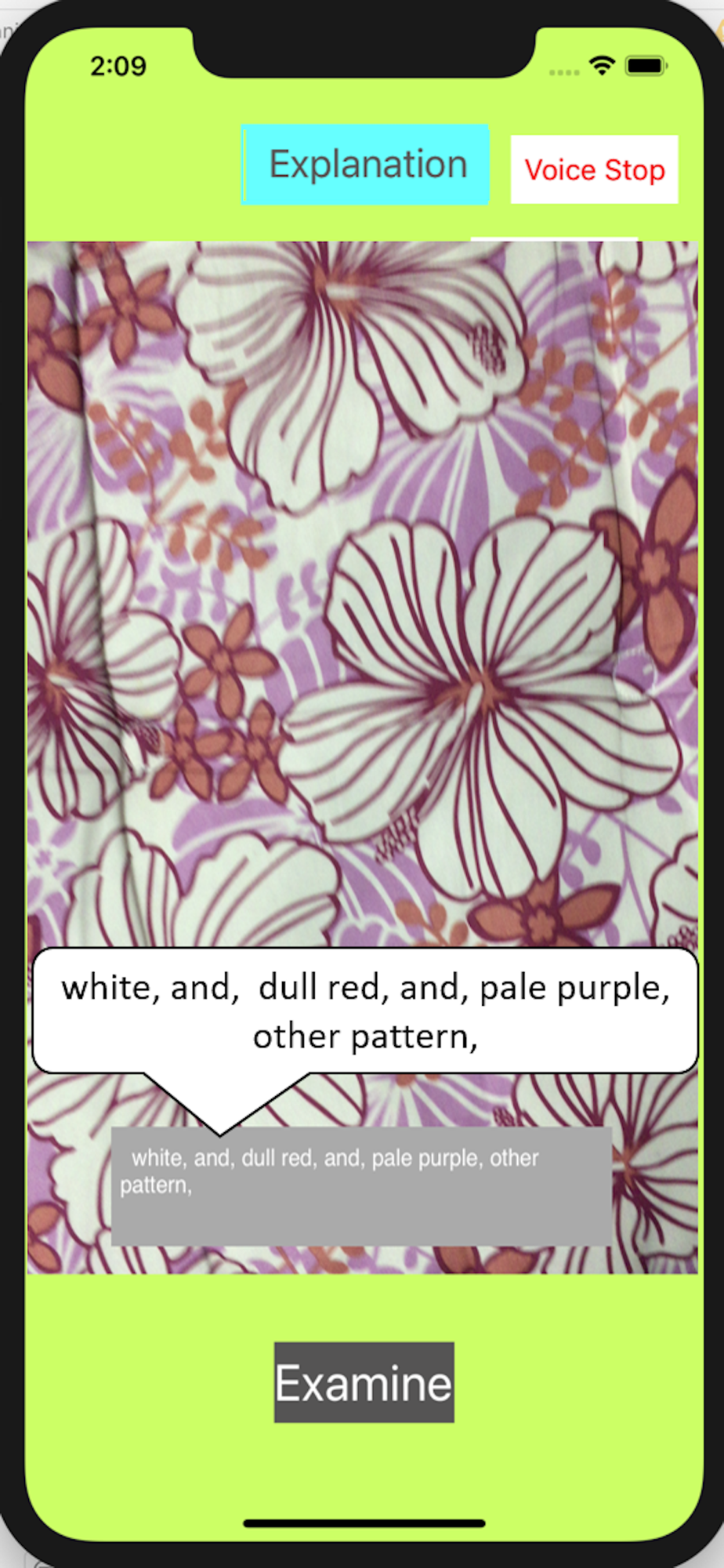 When you take a picture of clothes with this application, it speaks the color and pattern on clothes. The color included in clothes is expressed by up to 4 colors. The pattern is expressed by a category of 5, vertical stripes, horizontal stripes, checker, plain color and other pattern.