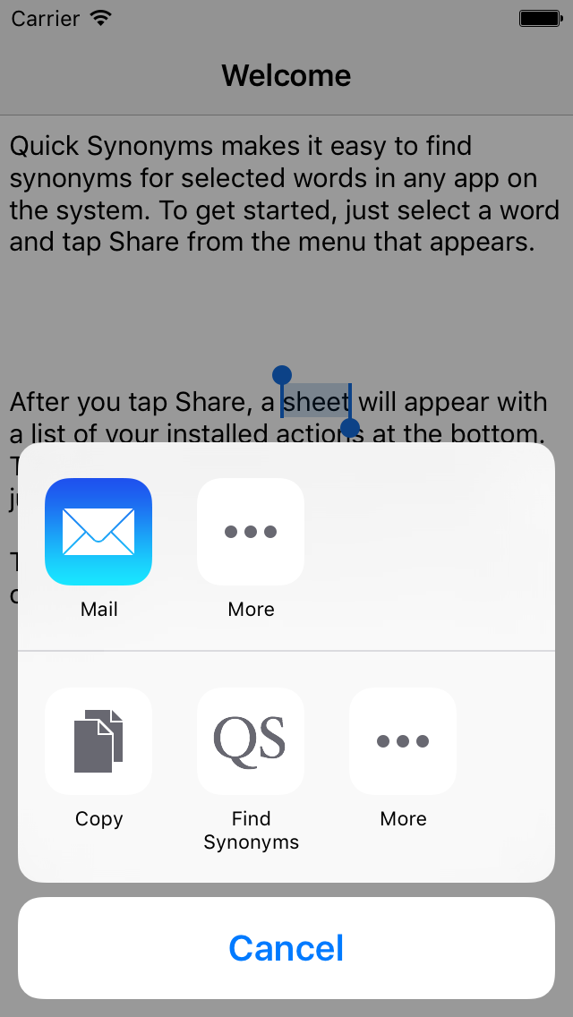 Quick Synonyms provides an iOS text action extension that makes it easy to look up synonyms for words in any app on the system.