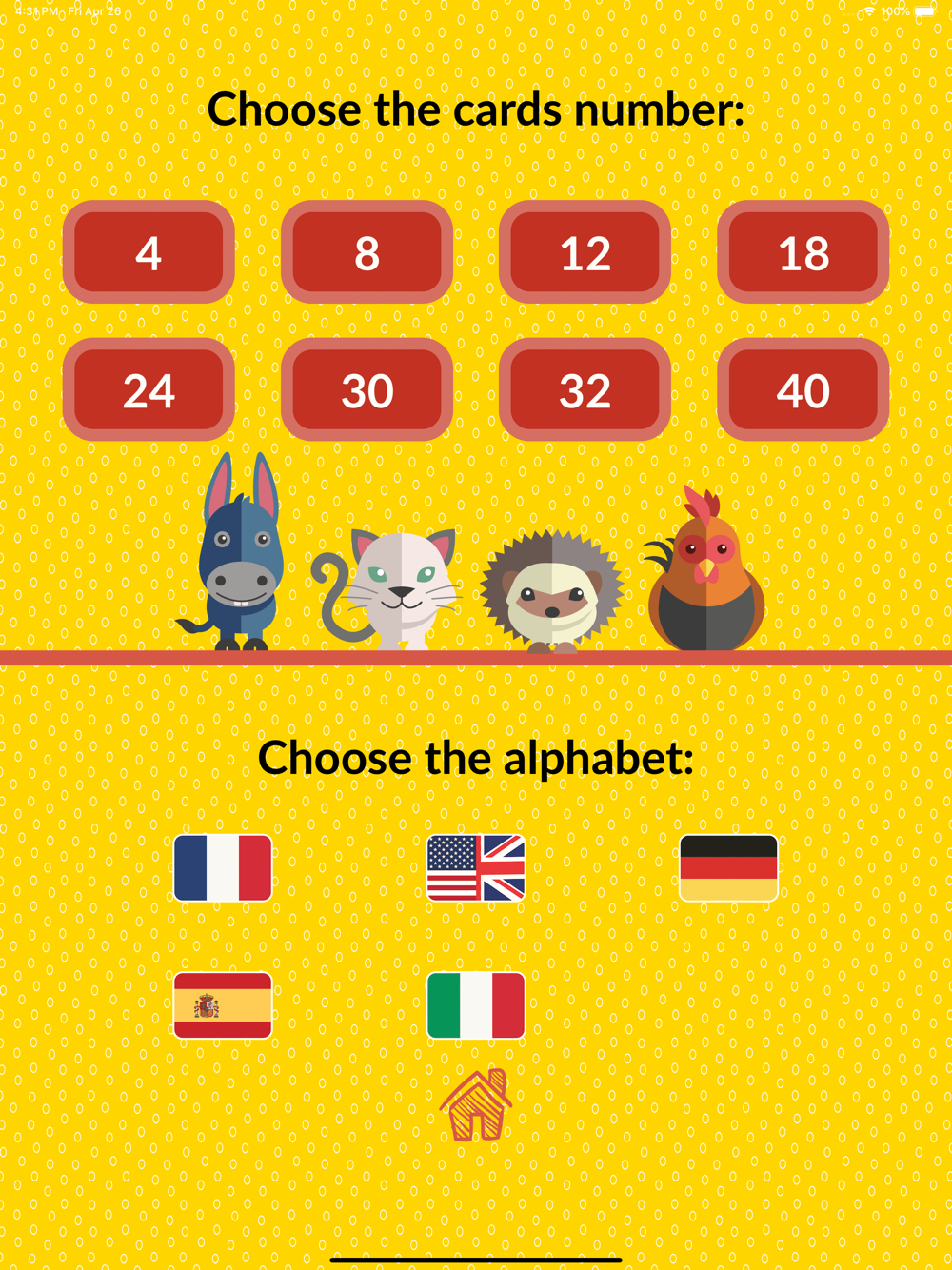 - Single game: you choose the number of cards and the language of the alphabet to play with;