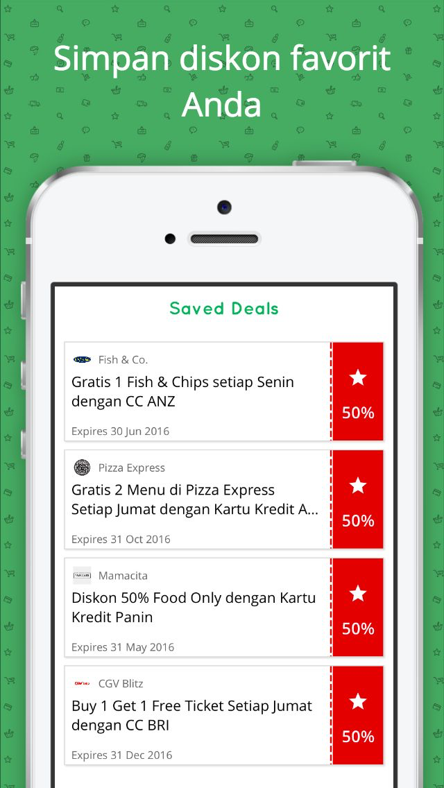 Punya berbagai kartu kredit? Cari diskon berdasarkan kartu kredit, debit, maupun alat pembayaran non-tunai lainnya yang Anda miliki. Anda juga bisa mencari diskon berdasarkan kategori, toko, atau keyword.