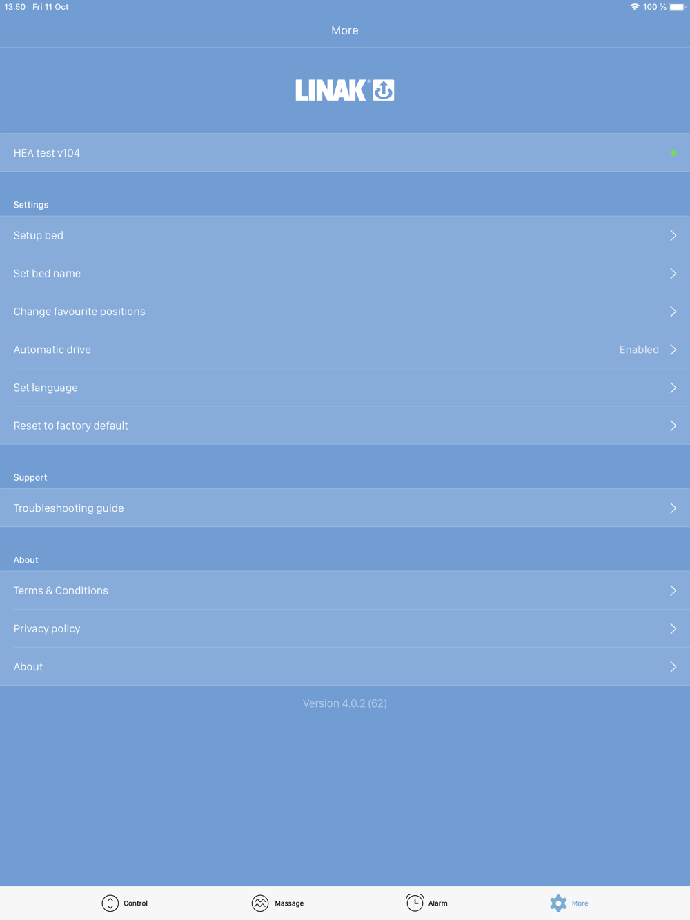 Use your mobile device to adjust your LINAK®-powered comfort bed. This app works with all LINAK TWINDRIVE® dual actuator systems as well as with the LINAK Bluetooth® adapter. The app works via Bluetooth® Low Energy. Specific features are only available for some bed systems.