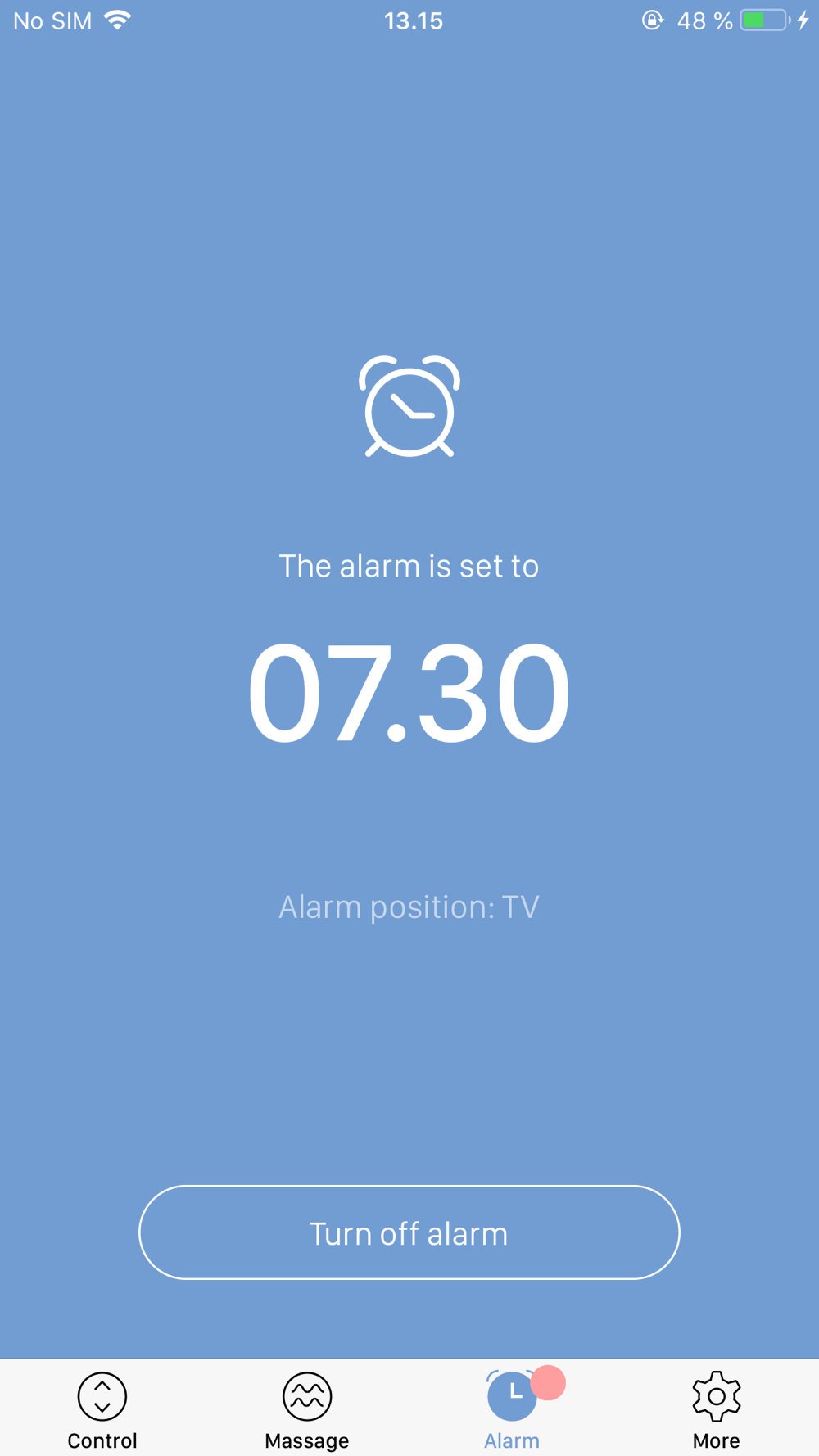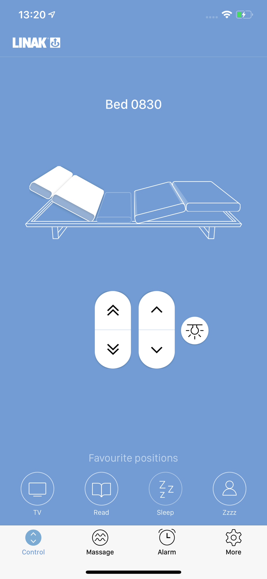 Use the LINAK Bed Control™ App to control up to four adjustment options (back, leg, neck and foot), and set the silent alarm to gently wake you up in the morning – with massage or slow movement to a favourite position. Specific features are only available for some bed systems.