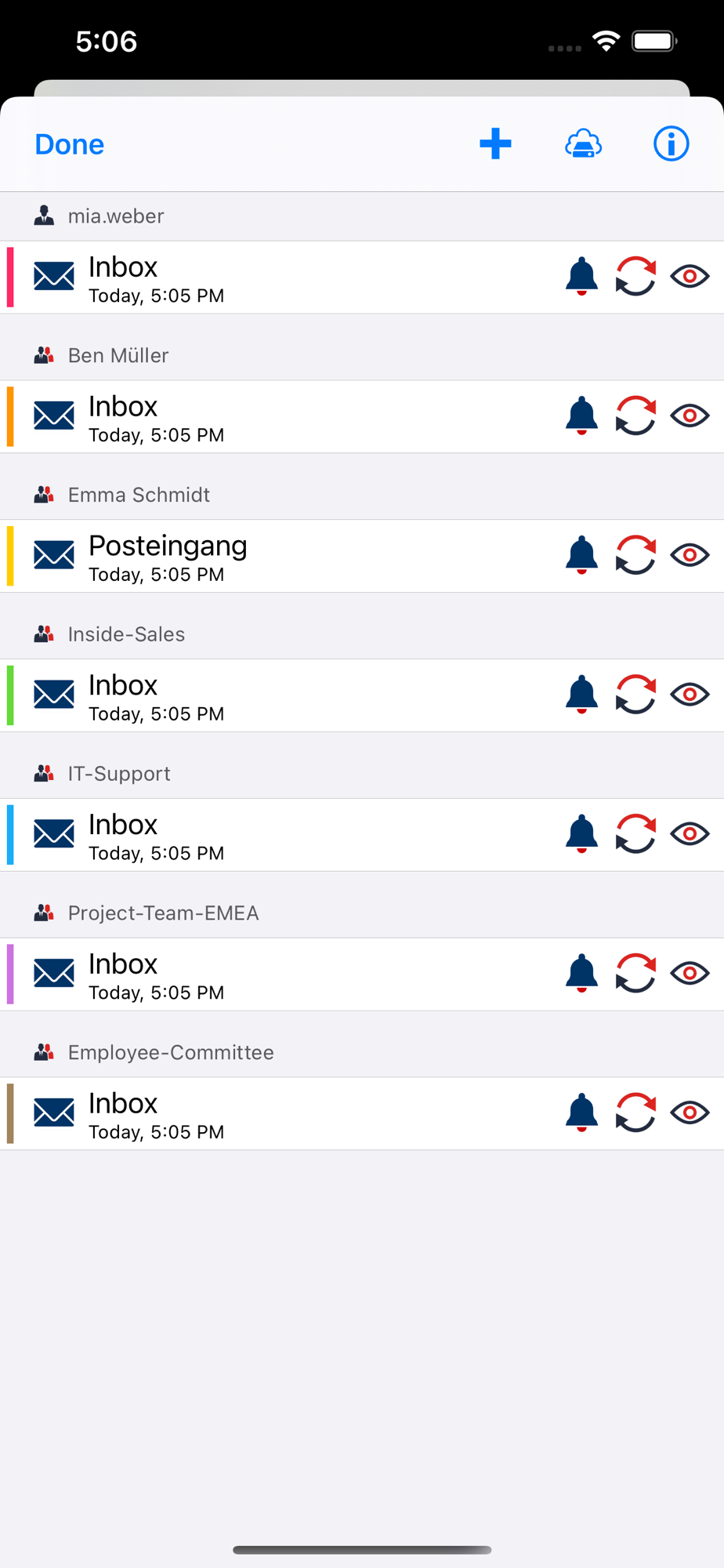 • Only 3 default folders for the master account (inbox, contacts, calendar)