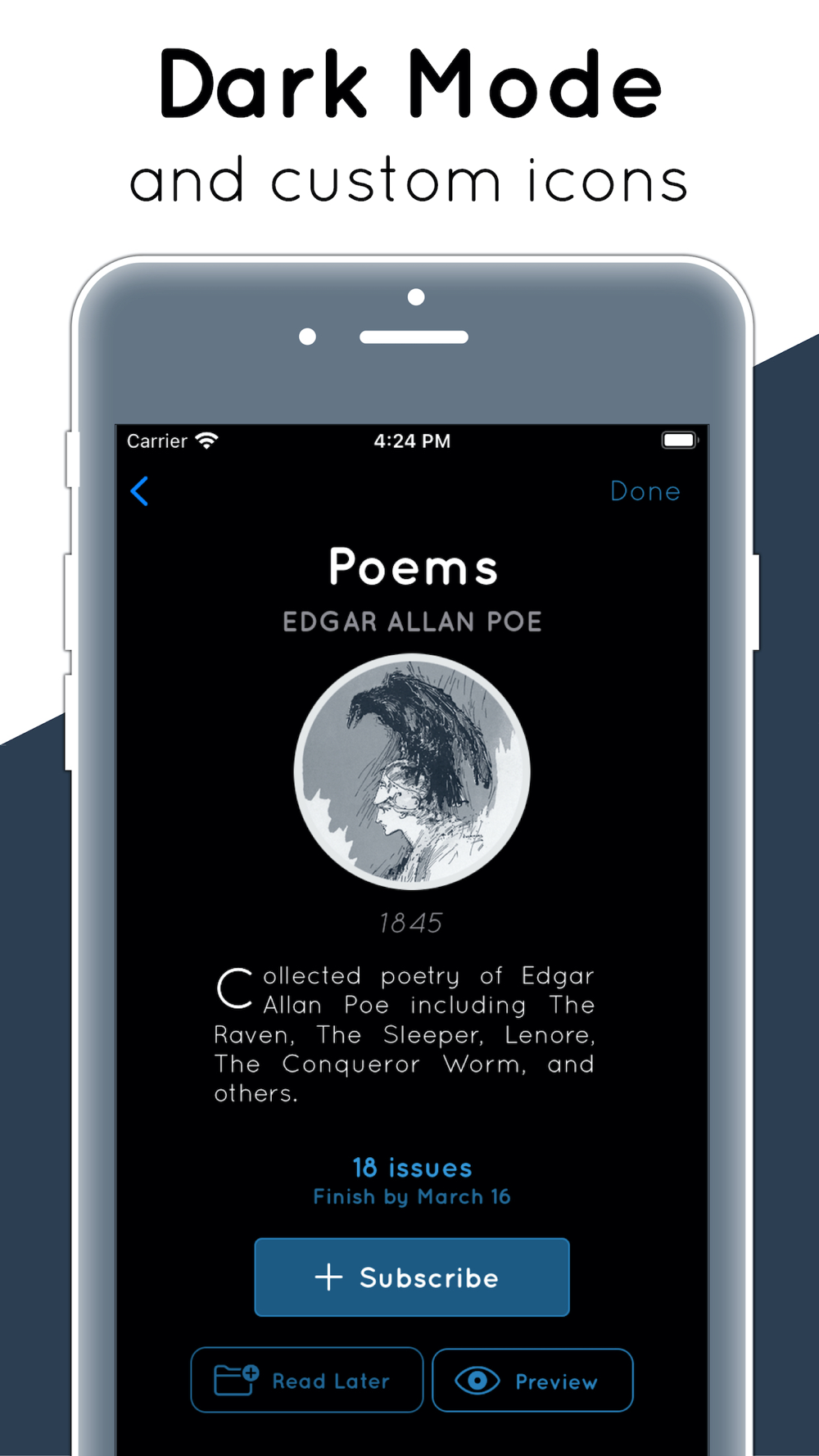 Serial Reader helps you fit more reading into your busy life. Choose from more than 900 books — or add your own! — and the app delivers a new issue from the book every day. Build great reading habits and tackle daunting classic books.