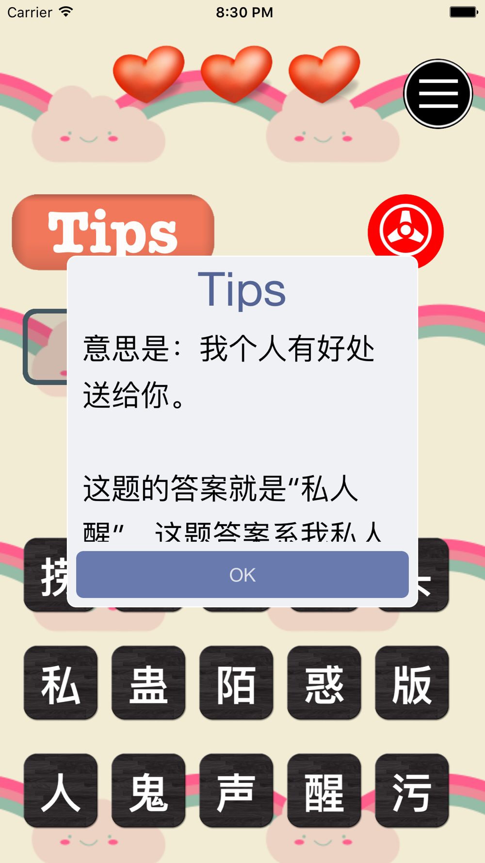 这是一个关于地道的粤语的俗语词组的文字游戏,当你通过一关的时候会有这个词的解释和是要例子,还有语音示例,有娱乐和学习一体的作用。玩法在就是把每一关问题的答案,在下面的随机排序的文字中寻找出来,并放在上方的空格中。来闯关吧!